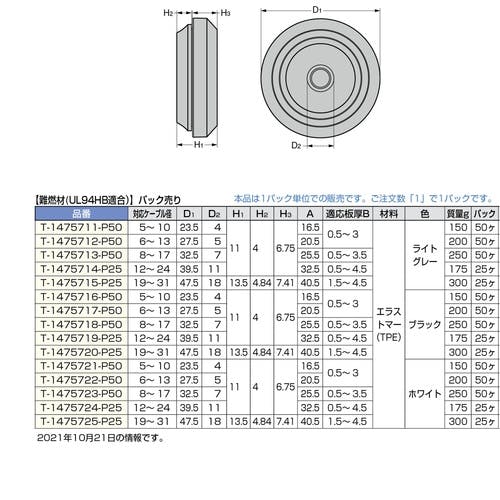 【CAINZ-DASH】スガツネ工業 (210039191)T-1475721-P50 防水・防塵グロメット フレキシブルタイプ 難燃材UL94HB適合 T-1475721-P50【別送品】