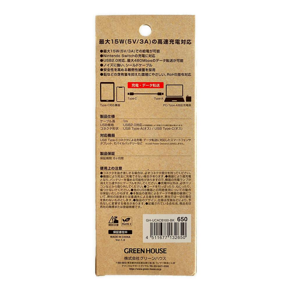 USB Type-A(オス) -USB Type-C(オス)充電/データ転送ケーブル GH-UCACB100-BK