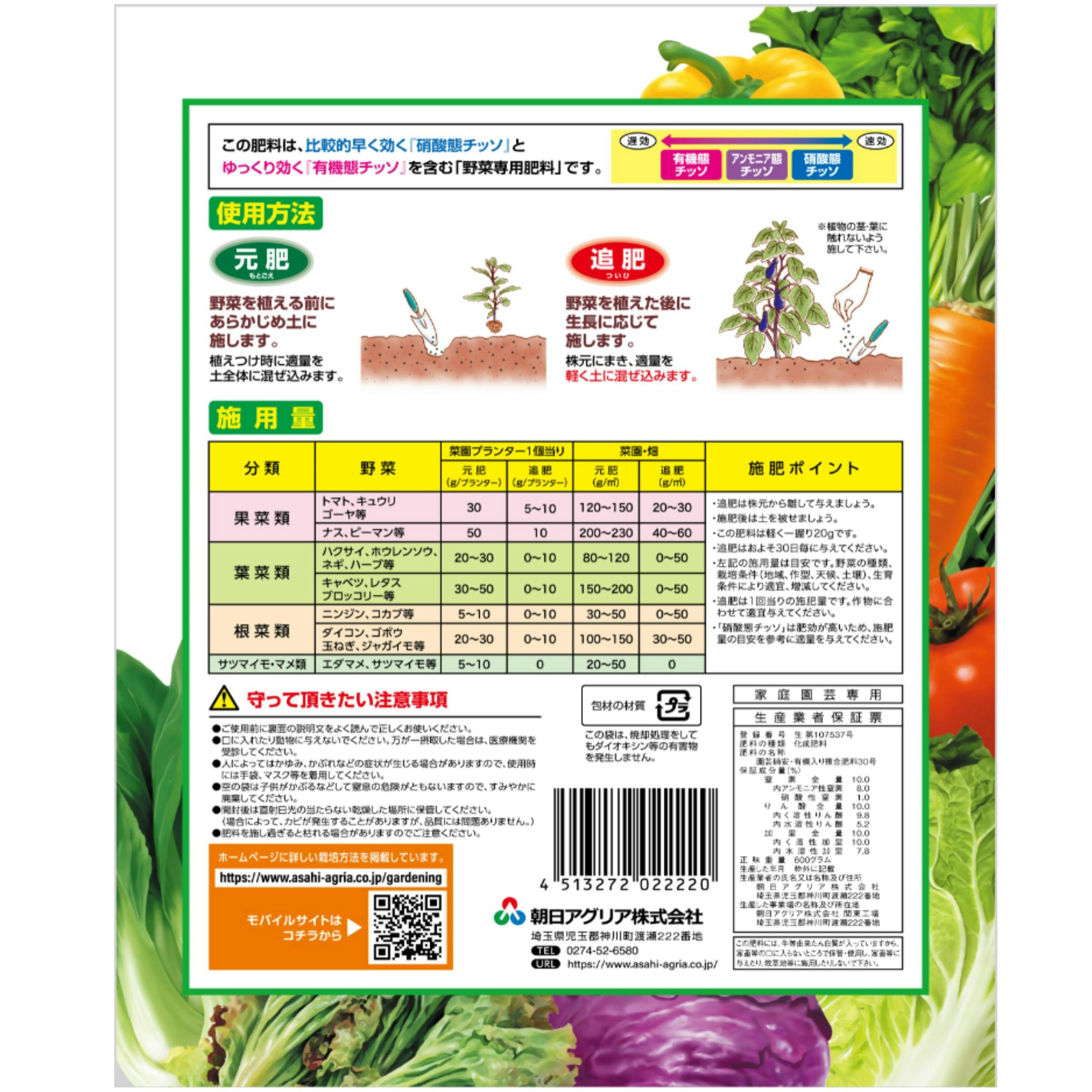 ●元肥として苗の植えつけ2週間前に土によく混ぜてください。●追肥は植物の根元から離れたところに与えてください。