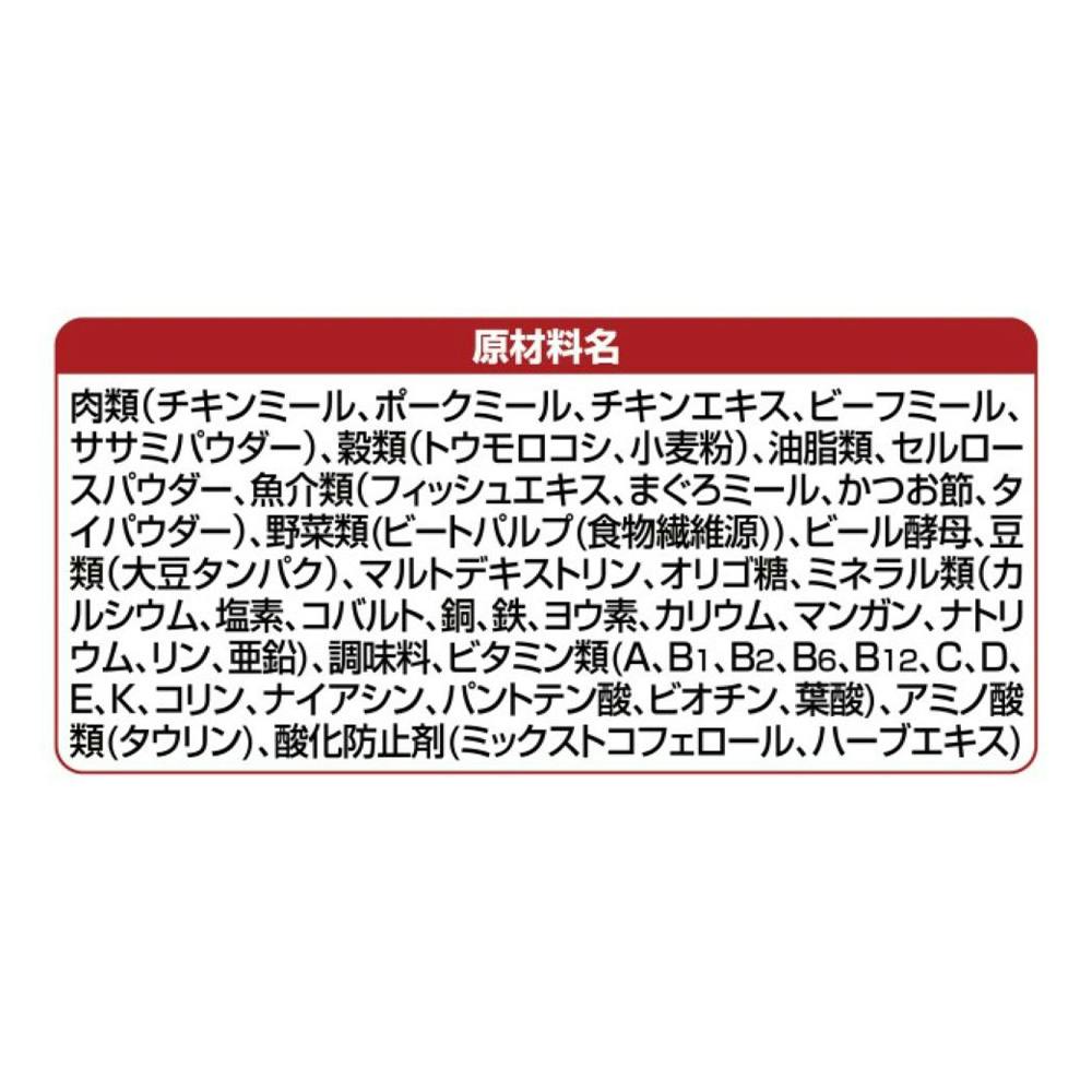 肉類、穀類、油脂類、セルロースパウダー、魚介類、野菜類、ビール酵母、豆類、マルトデキストリン、オリゴ糖、ミネラル類、調味料、ビタミン類、アミノ酸類、酸化防止剤