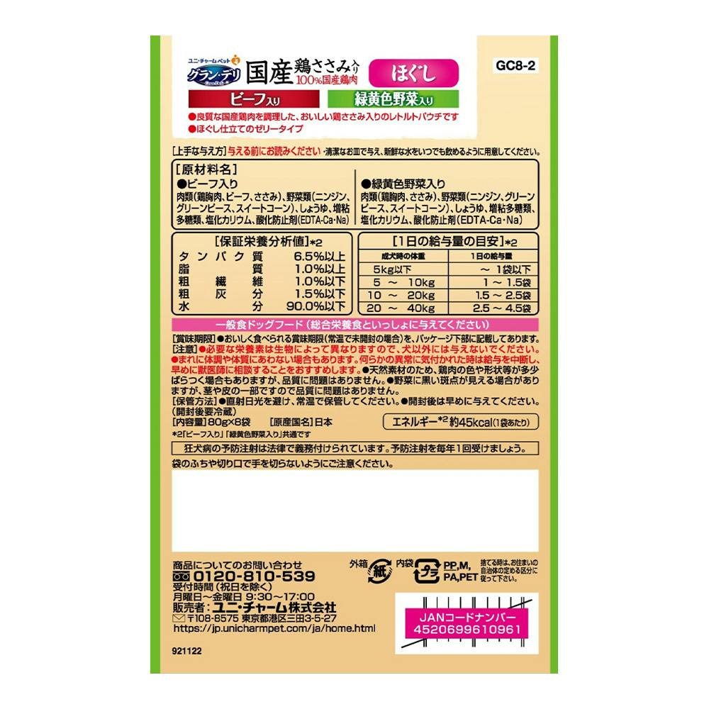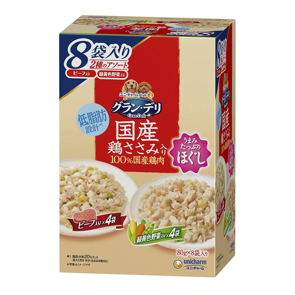 グラン・デリ 国産鶏ささみほぐし パウチ 2種のアソート ビーフ&緑黄色野菜入り 80g×8袋