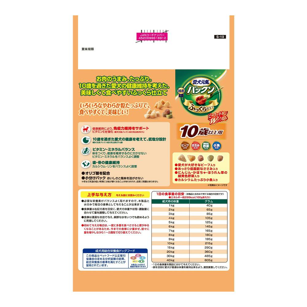 ●やわらかくて食べやすいふっくら仕立て●健康維持により、免疫力維持をサポートビタミンEを強化●10歳を過ぎた愛犬の健康を考えて低塩分設計(愛犬元気パックン成犬用比約25%減)●ビーフ、ささみ、緑黄色野菜、小魚入り●総合栄養食(国産)