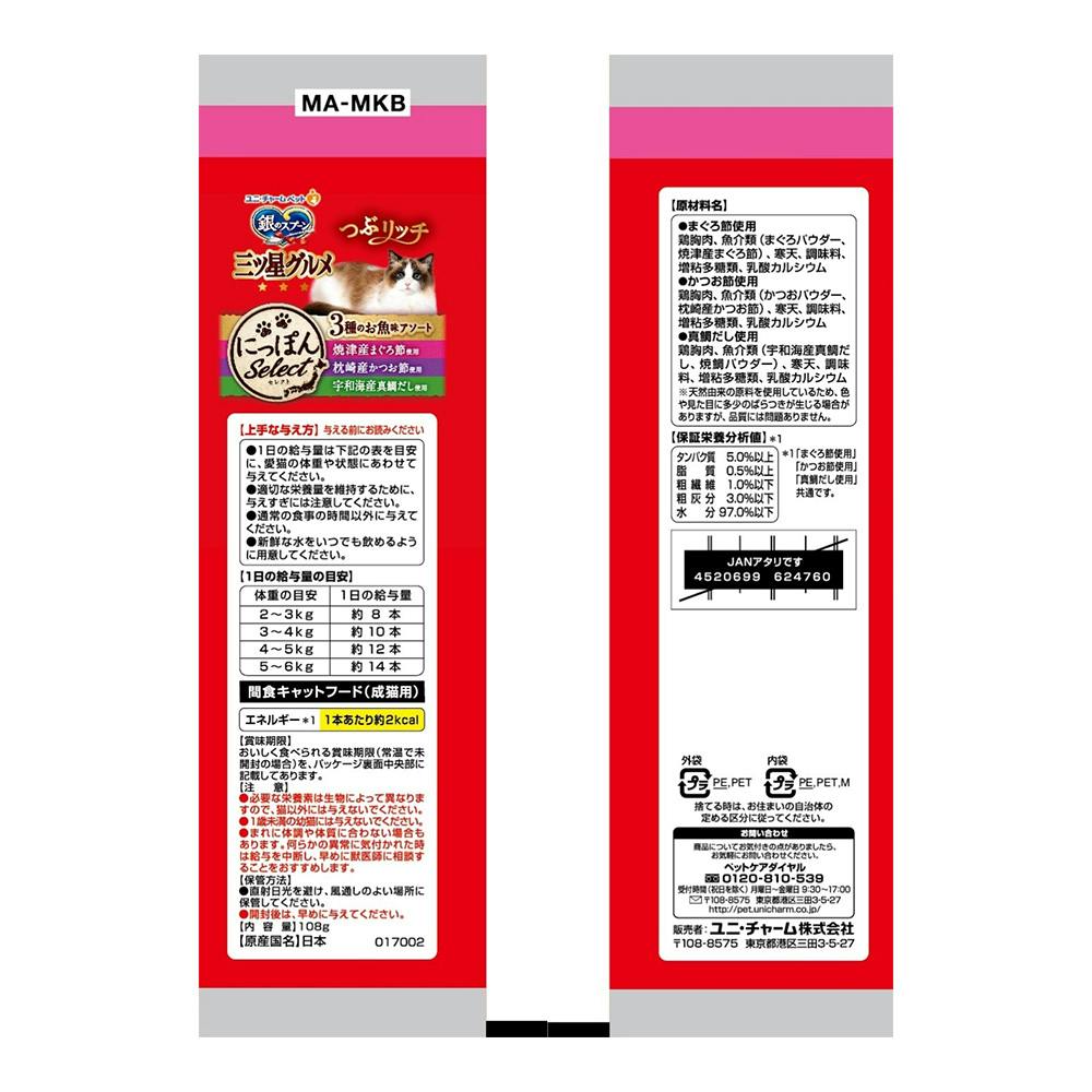 ●まぐろ節使用:鶏胸肉、魚介類(まぐろパウダー、焼津産まぐろ節)、寒天、調味料、等●かつお節使用:鶏胸肉、魚介類(かつおパウダー、枕崎産かつお節)、寒天、調味料、等●真鯛だし使用:鶏胸肉、魚介類(宇和海産真鯛だし、焼鯛パウダー)、寒天、調味料、等