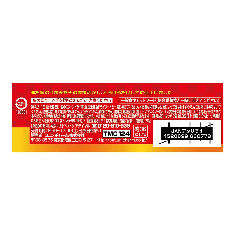 魚介類(かつお、まぐろ、フィッシュエキス)、肉類(ささみ)、調味料、増粘安定剤(加工デンプン、グアーガム)