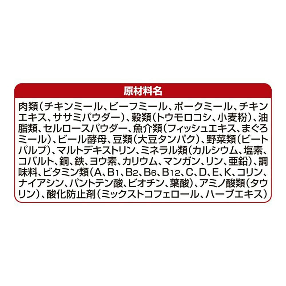 肉類(チキンミール、ポークミール、ビーフミール、チキンエキス、ササミパウダー)、穀類(トウモロコシ、小麦粉)、油脂類、セルロースパウダー、魚介類(フィッシュエキス、マグロミール)、ビール酵母、豆類(大豆タンパク)、野菜類(ビートパルプ)、他