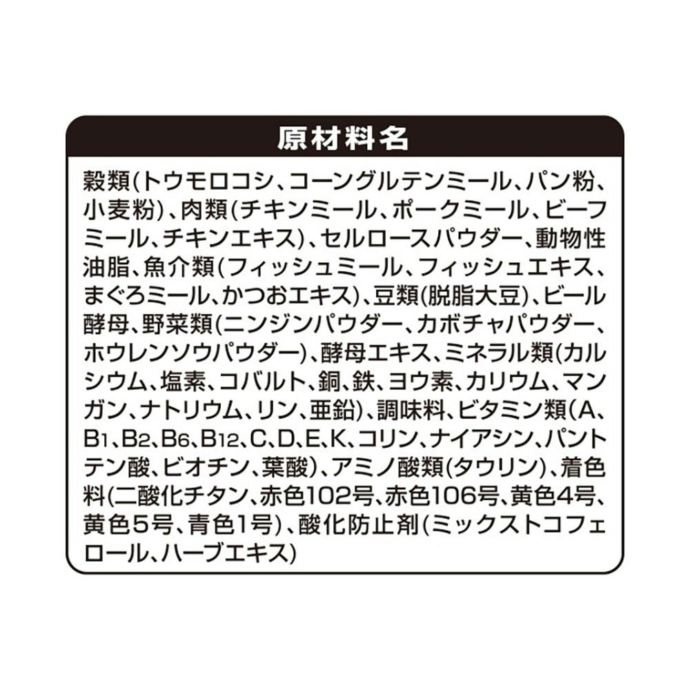 穀類(トウモロコシ、コーングルテンミール、パン粉、小麦粉)、肉類(チキンミール、ポークミール、ビーフミール、チキンエキス)、セルロースパウダー、動物性油脂、魚介類、豆類、ビール酵母、野菜類、酵母エキス、ミネラル類、アミノ酸類、ビタミン類、着色料、酸化防止剤