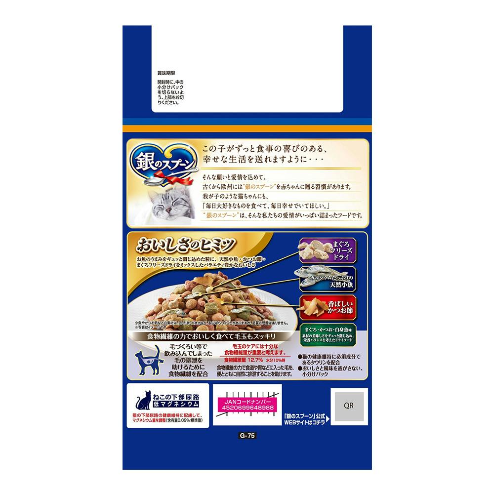 ●お魚のうまみをたっぷり閉じ込めた粒に、天然小魚やかつお節、まぐろフリーズドライをミックスしたバラエティ豊かなおいしさ●毛づくろい等で飲み込んでしまった毛の排泄を助けるために、食物繊維を配合