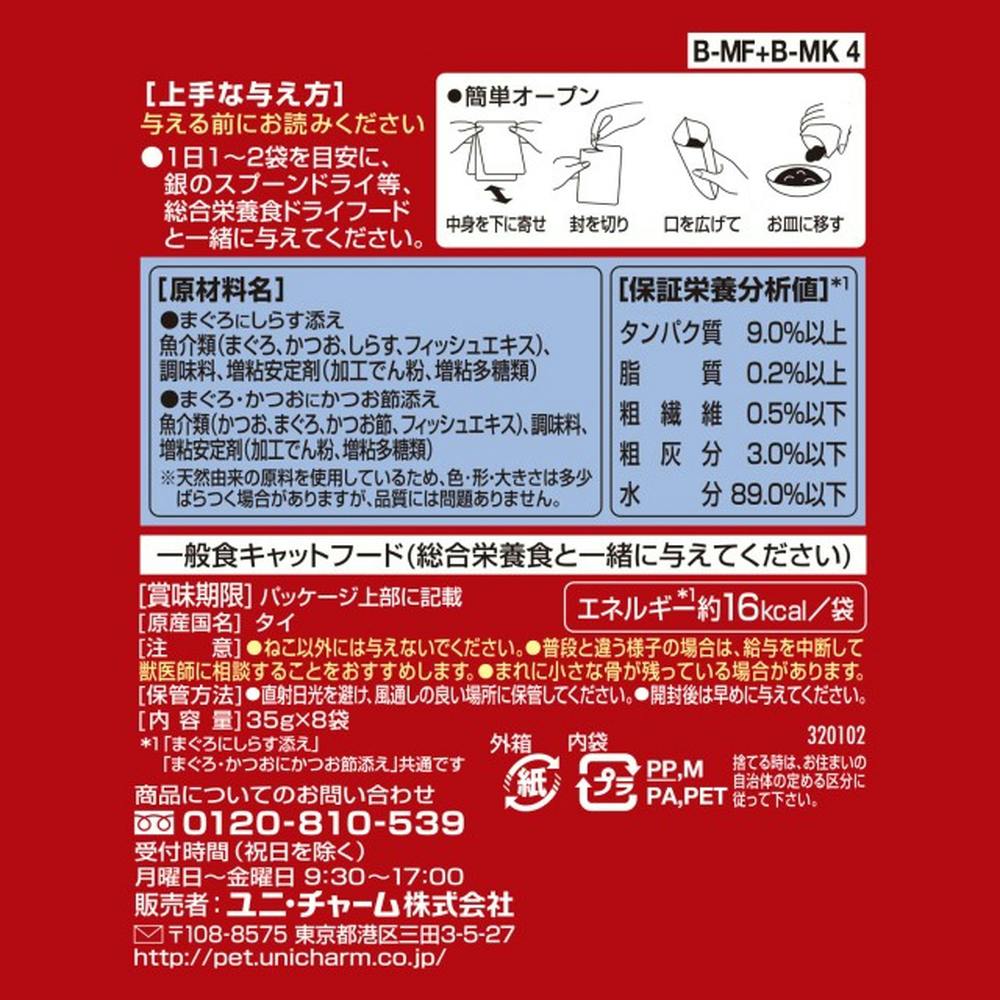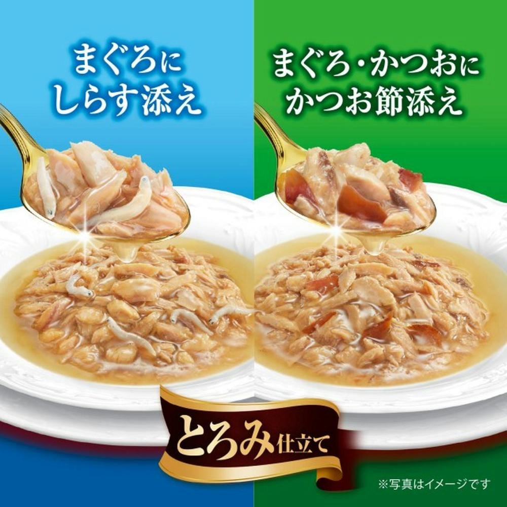 ●まぐろにしらす添え:魚介類(まぐろ、かつお、しらす、フィッシュエキス)、調味料、増粘安定剤(加工でん粉、増粘多糖類)●まぐろ・かつおにかつお節添え:魚介類(かつお、まぐろ、かつお節、フィッシュエキス)、調味料、増粘安定剤(加工でん粉、増粘多糖類)