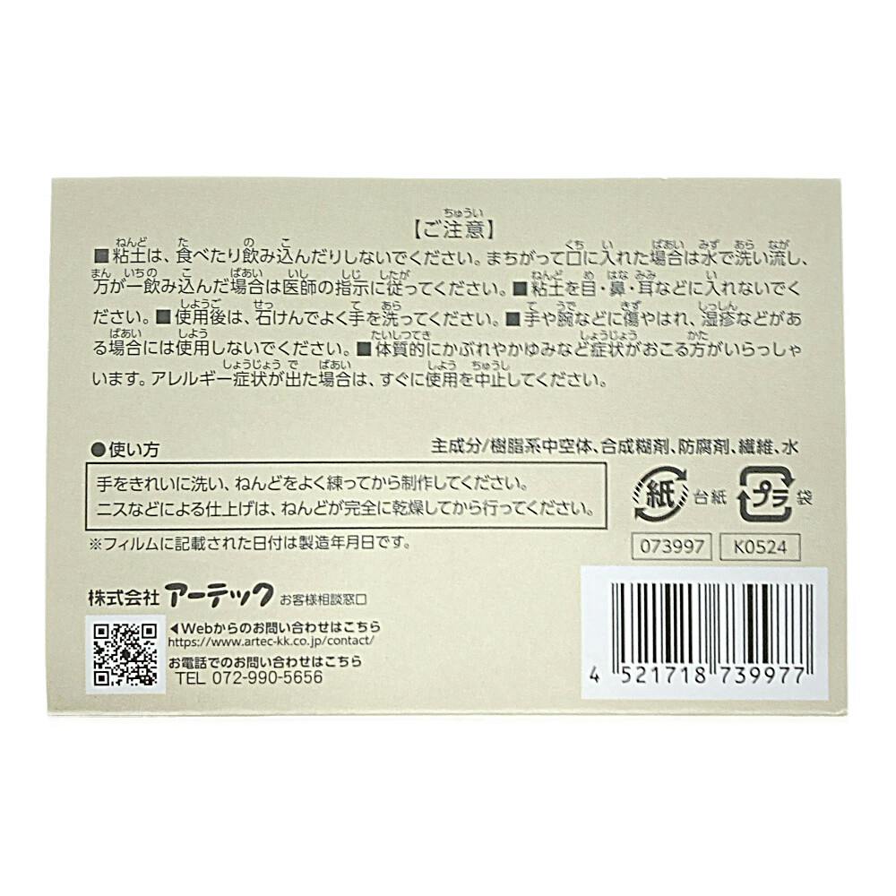 しっとりとなめらかな質感で、よく伸びる粘土です。きめが細かくひび割れがしづらいので繊細な造形が可能です。手につきづらく粘土同士がまとまりやすいのでお部屋が汚れません。