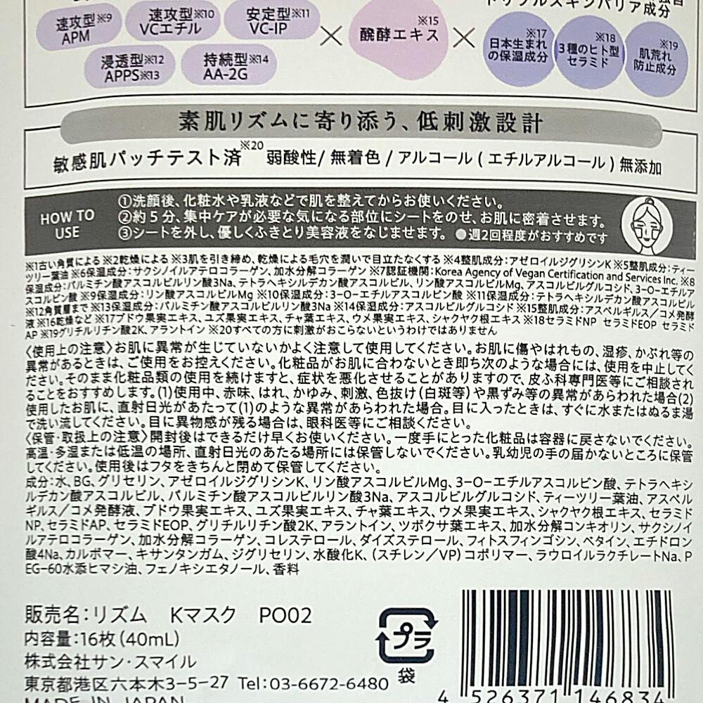 1.洗顔後、化粧水や乳液などで肌を整えてからお使いください 2.約5分、集中ケアが必要な気になる部位にシートをのせ、お肌に密着させます 3.シートを外し、優しくふきとり美容液をなじませます ※週2回程度がおすすめです