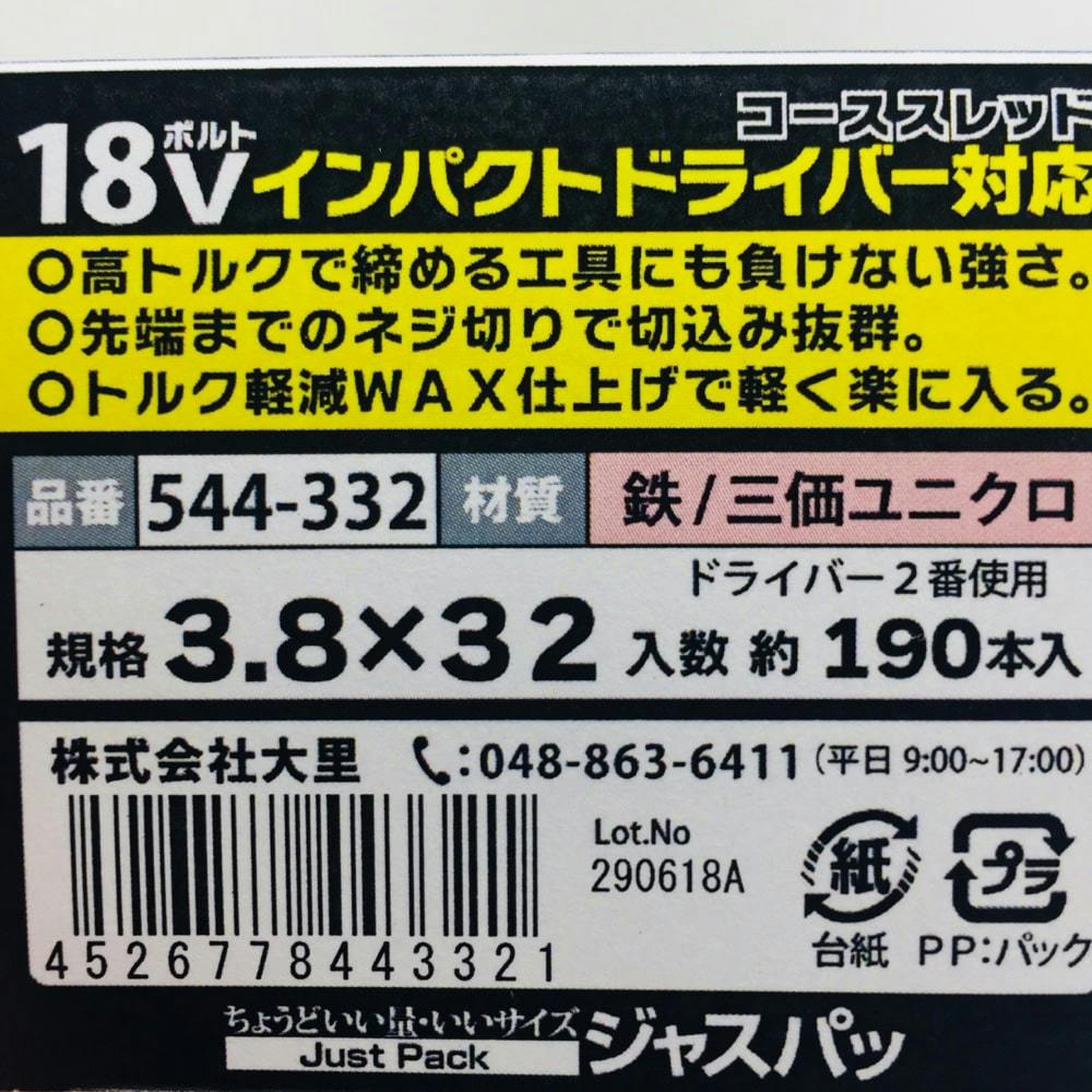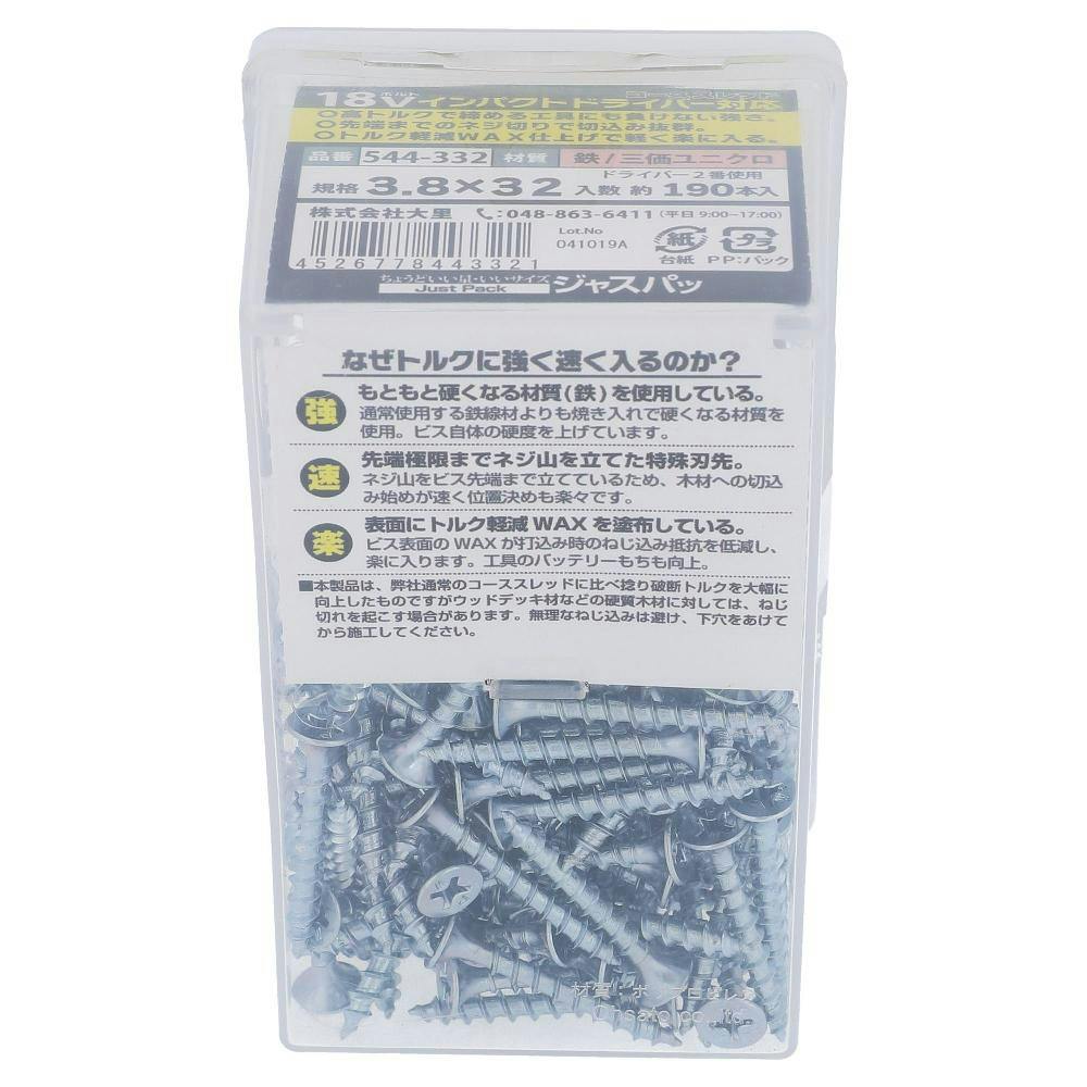 18Vインパクトドライバー対応コーススレッド 全ねじ 544-332 3.8×32mm 190本