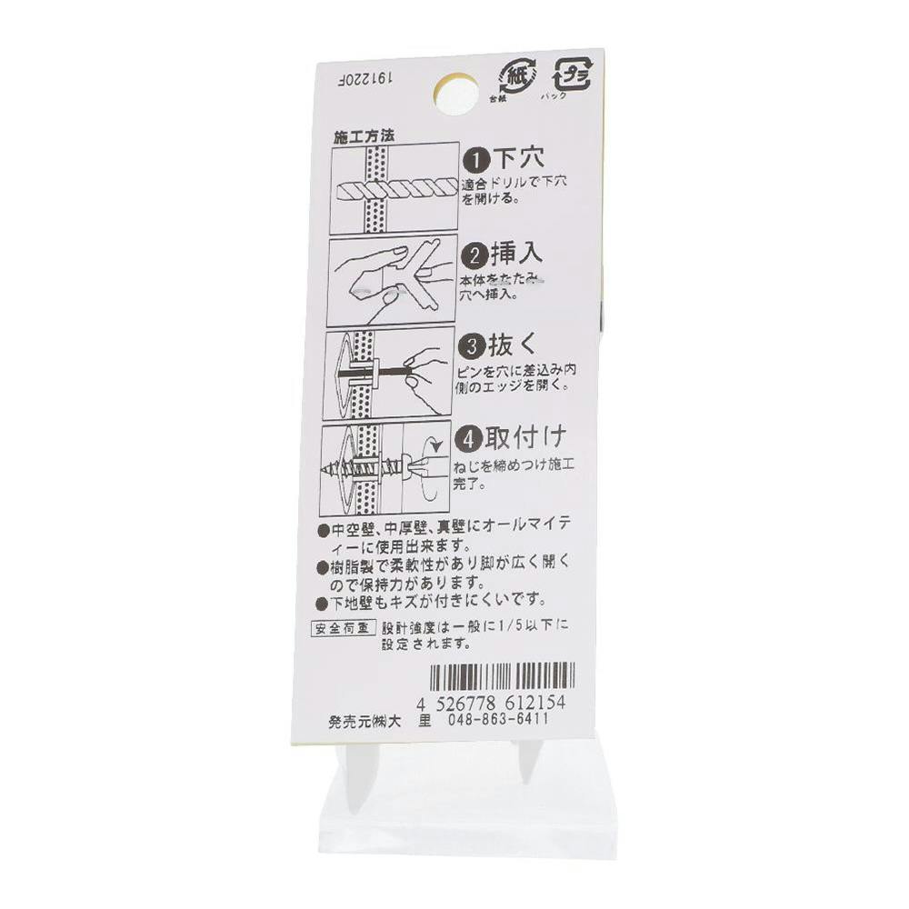 ●中空壁、中厚壁、真壁にオールマイティーで使用できる ●樹脂製で柔軟性があり、足が広く開くので、保持力がある。