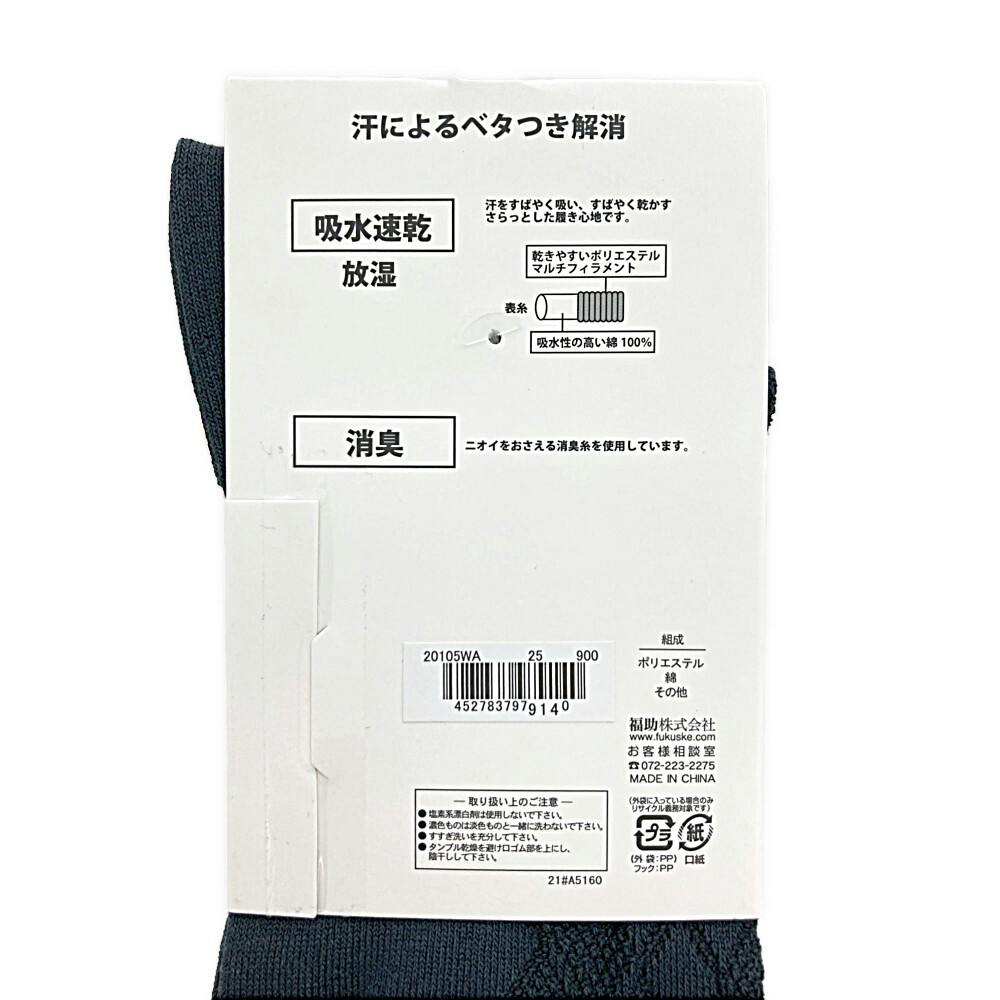 ●汗によるベタつき解消 ●吸水速乾/汗をすばやく吸い、すばやく乾かすさらっとした履き心地です。乾きやすいポリエステルマルチフィラメント。吸水性の高い綿100%。●放湿 ●消臭/ニオイをおさえる消臭糸を使用しています