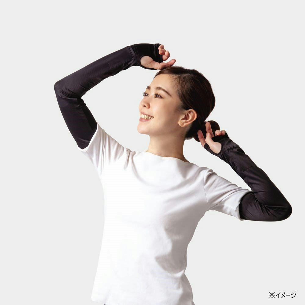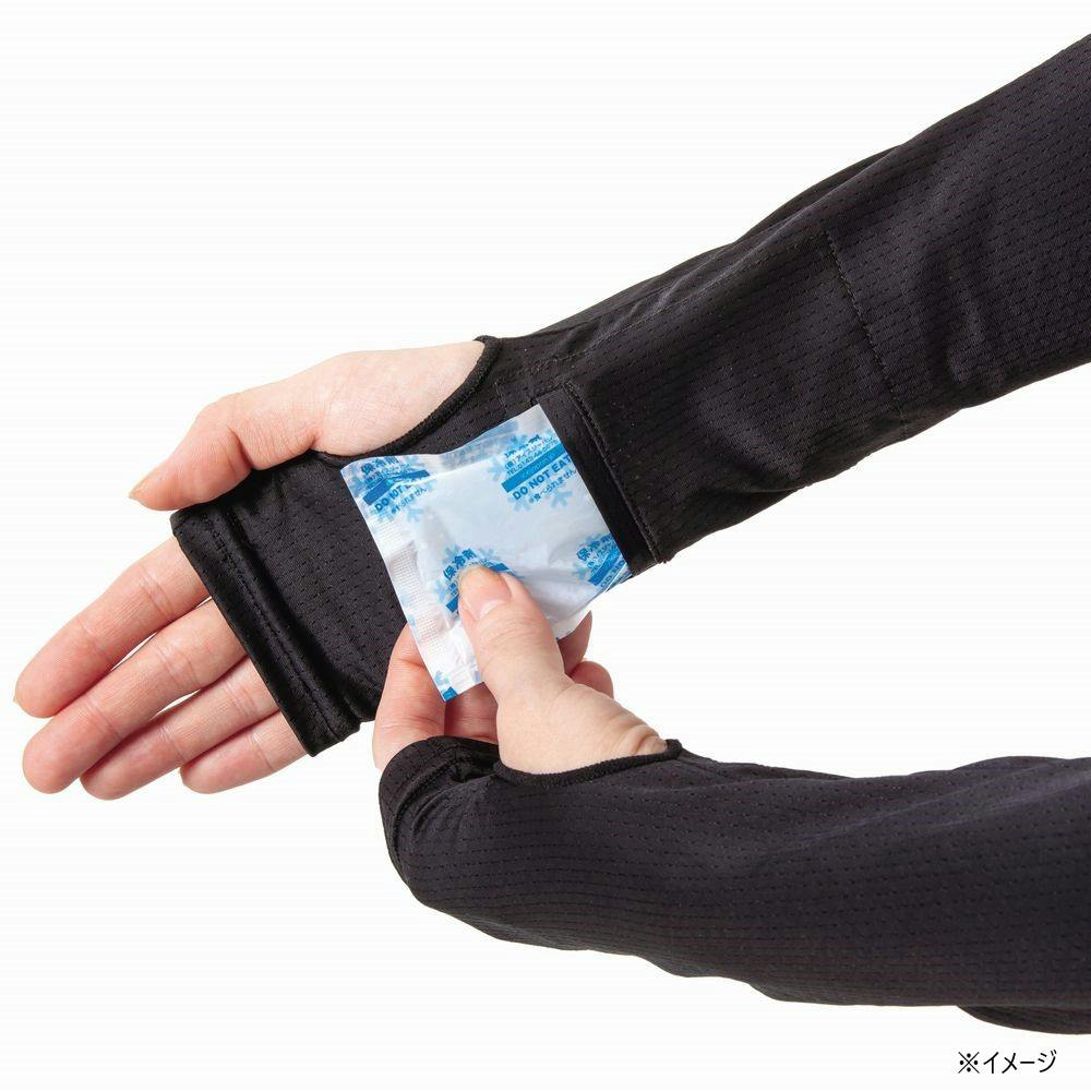 保冷剤ポケットに保冷剤を入れてリアルにクール。指穴付きで、手の甲まで覆えるロング丈サイズのアームカバー。保冷剤2個付き。接触冷感仕様。