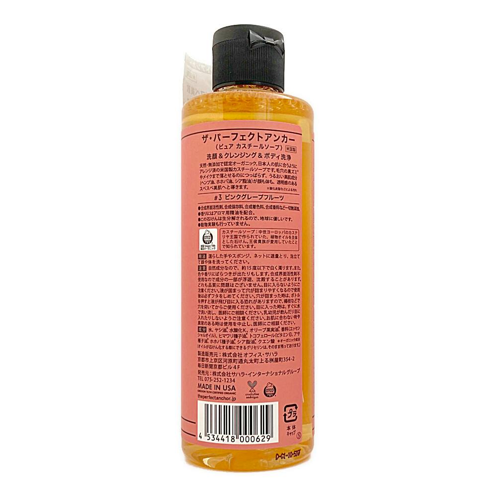 水、ヤシ油※、水酸化K、オリーブ果実油※、香料(エッセンシャルオイル)、ヒマワリ種子油※、トコフェロール(ビタミンE)、アサ種子油※、ホホバ種子油※、シア脂油※、クエン酸 (※オーガニック成分)