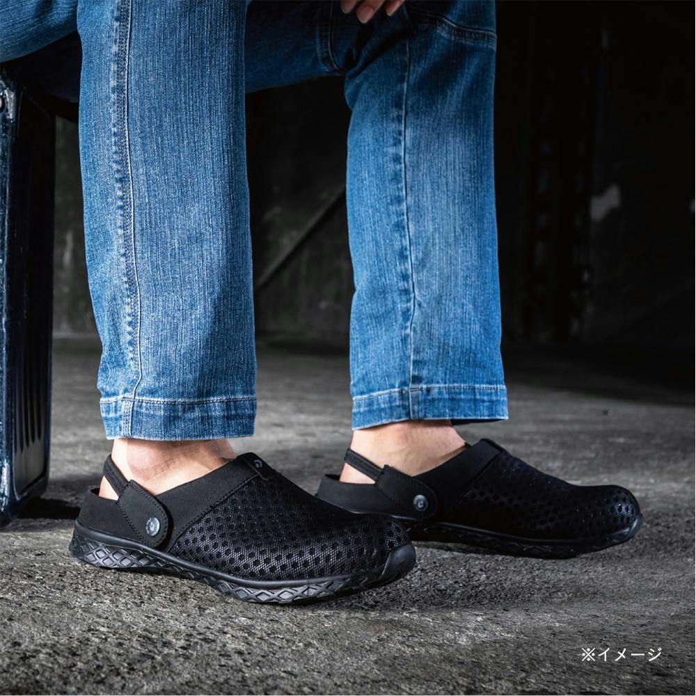 通気性と疲労防止形状、抗菌防臭加工で軽快な足運びをサポート。表面ナイロンメッシュと穴あきEVAシート、接地面に穴の開いた通気ソールを使用。ワークシーンはもちろんのこと街履きにもできるオリジナルデザイン。