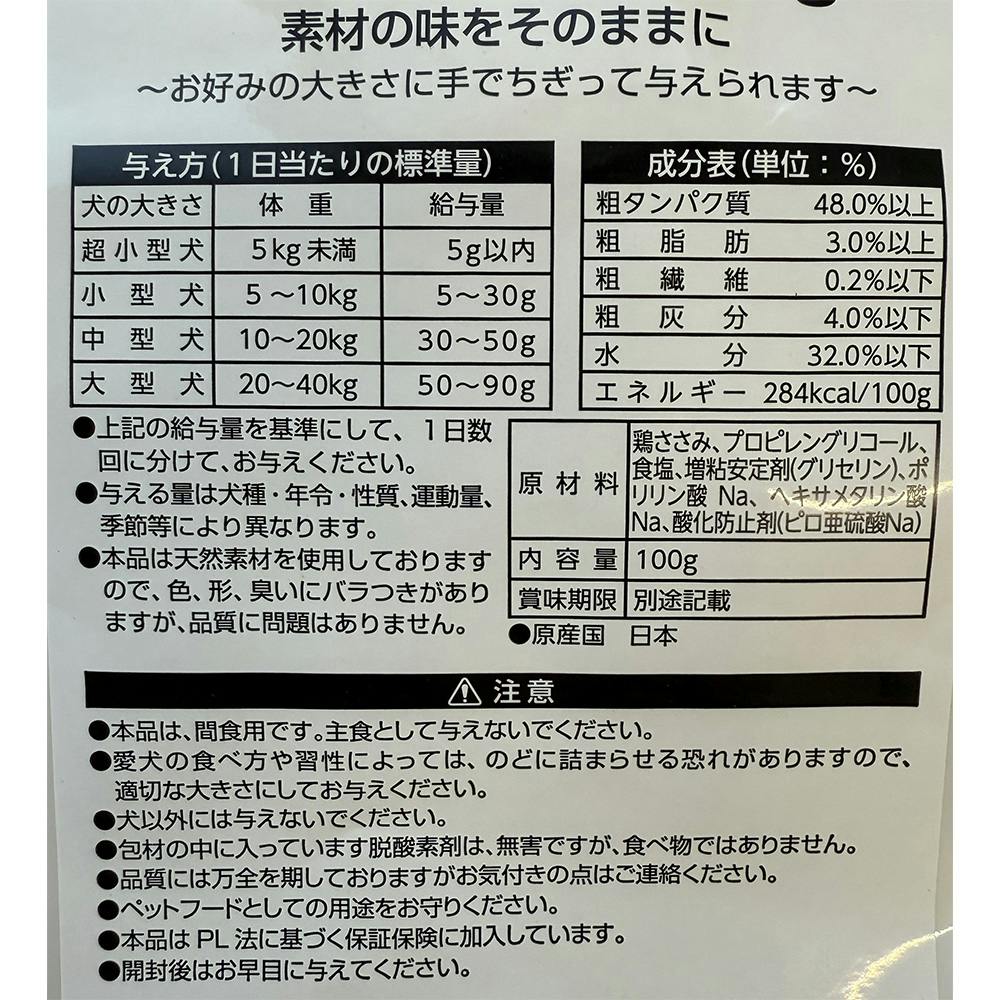 鶏ささみ、プロピレングリコール、食塩、増粘安定剤(グリセリン)、ポリリン酸Na、ヘキサメタリン酸Na、酸化防止剤(ピロ亜硫酸Na)