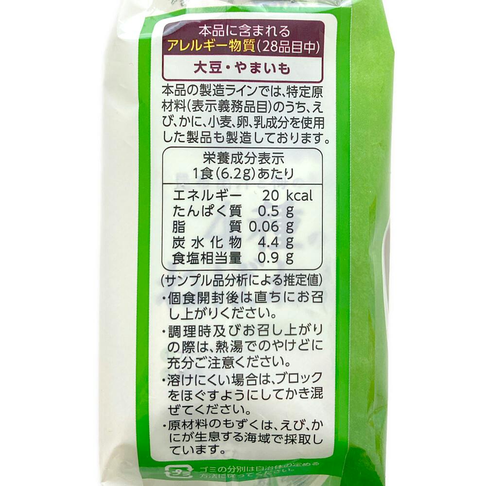 栄養成分表示1食(6.2g)あたり/エネルギー:20kcal、たんぱく質:0.5g、脂質:0.06g、炭水化物:4.4g、食塩相当量:0.9g