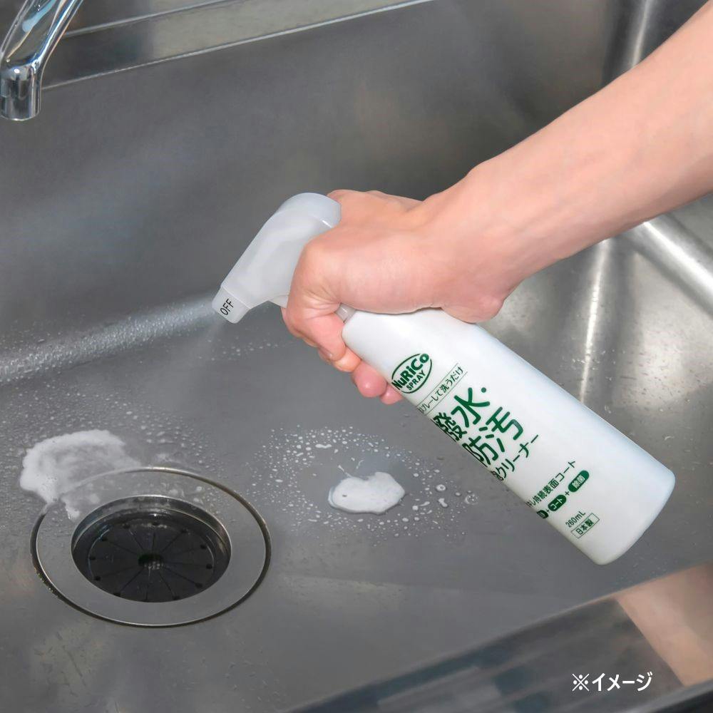 週一回スプレー後にスポンジで擦ることにより、洗面台、キッチンシンク、トイレ等の家庭内の水回りのステンレス、衛生陶器、樹脂製品の汚れを落とすと同時に、コーティング効果により日常のお掃除の回数と時間が削減できます。除菌剤の効果により除菌もできます。