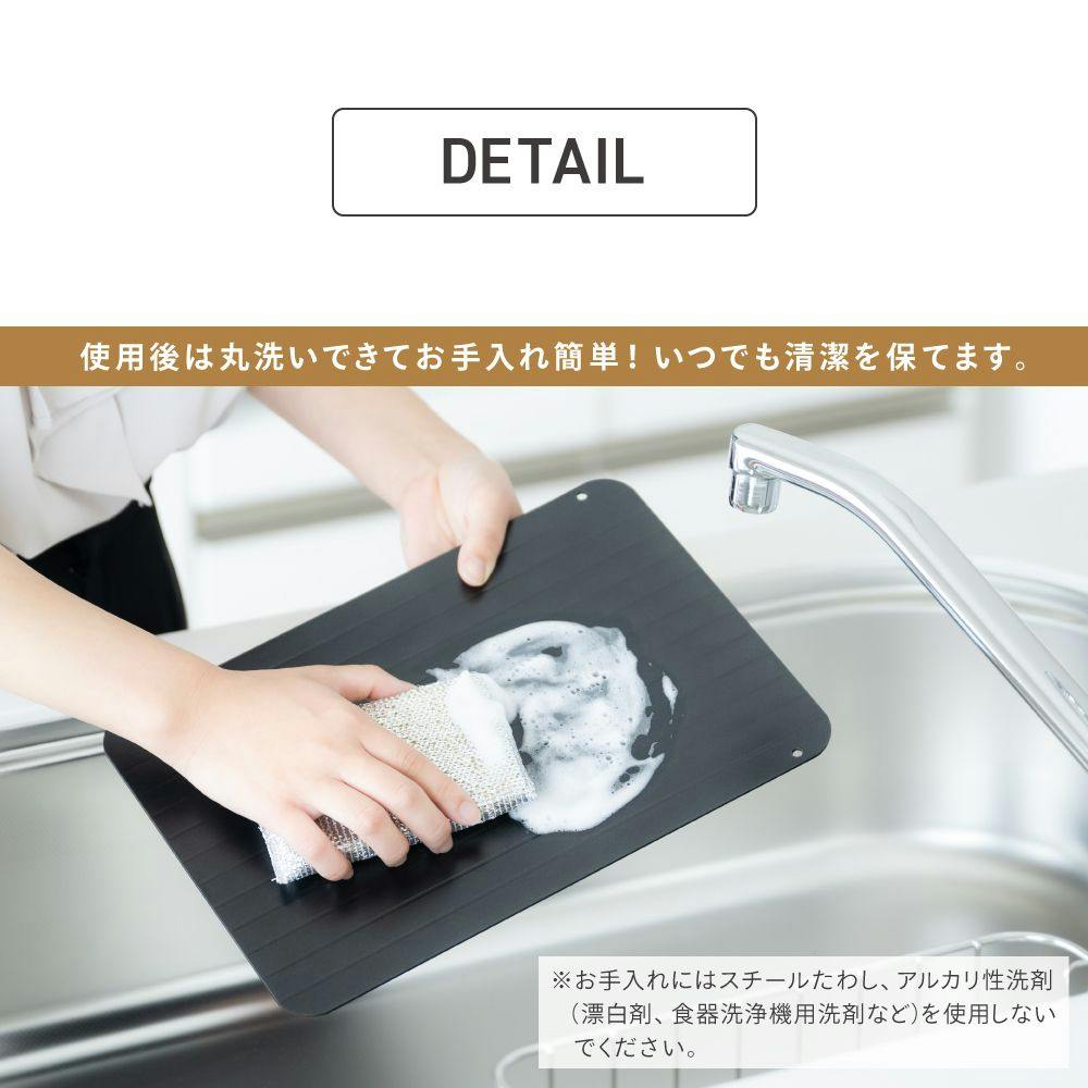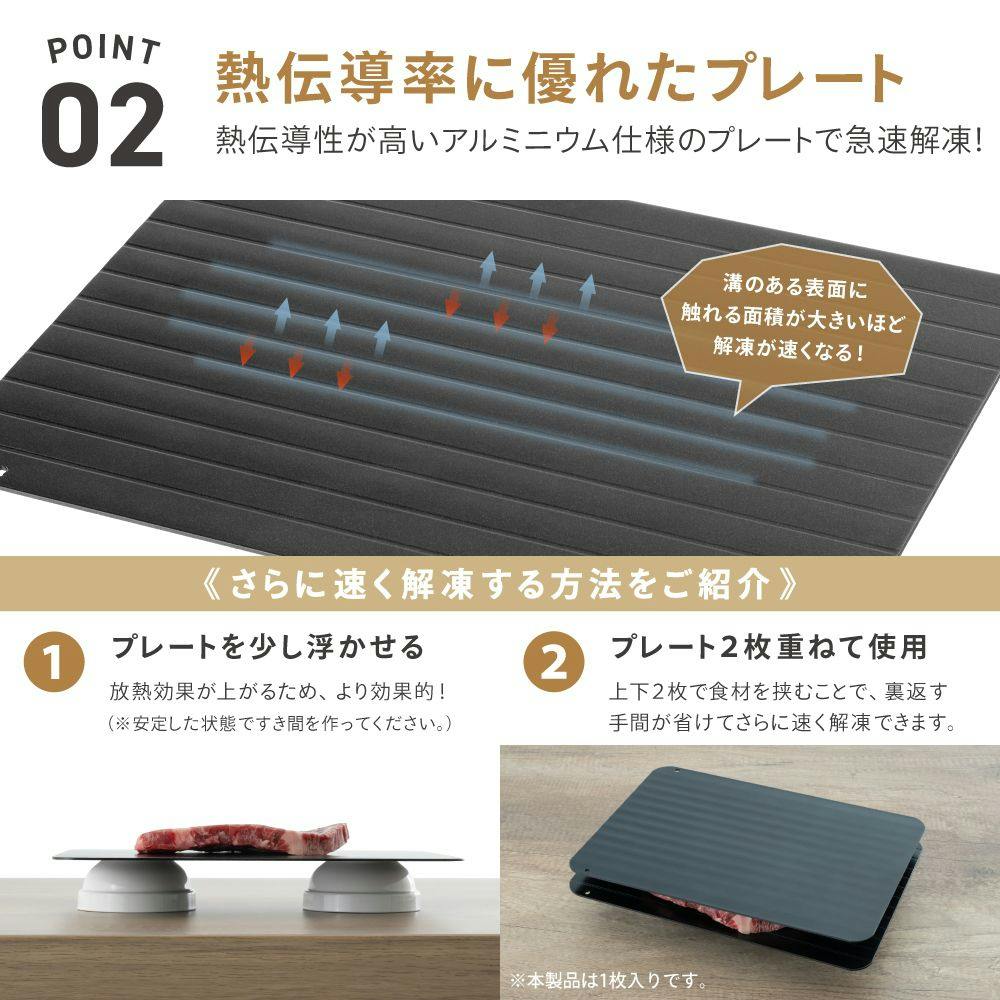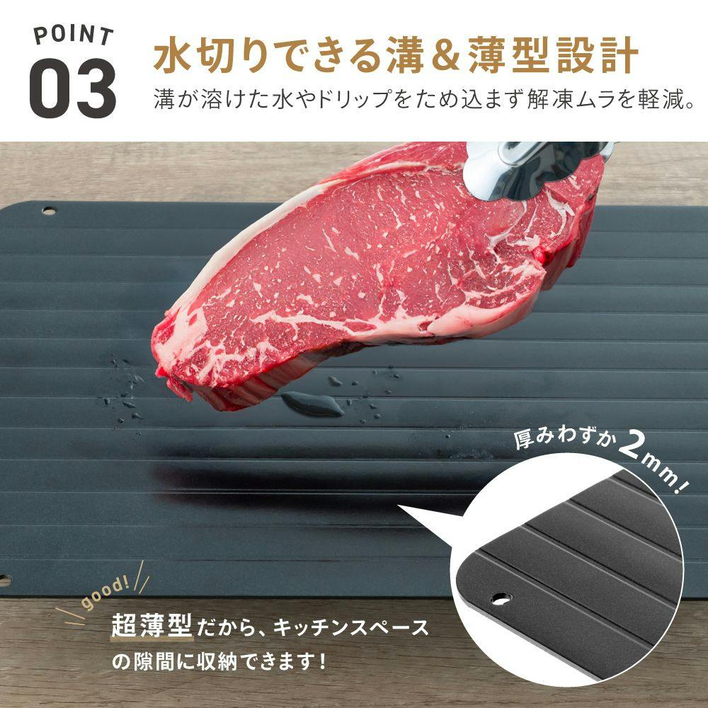 ①本製品の表面に冷凍食材を載せます。②接する面が溶けてきたら裏返して反対側も溶かします。③お好みの解凍具合になったら食材を取り出してください。
