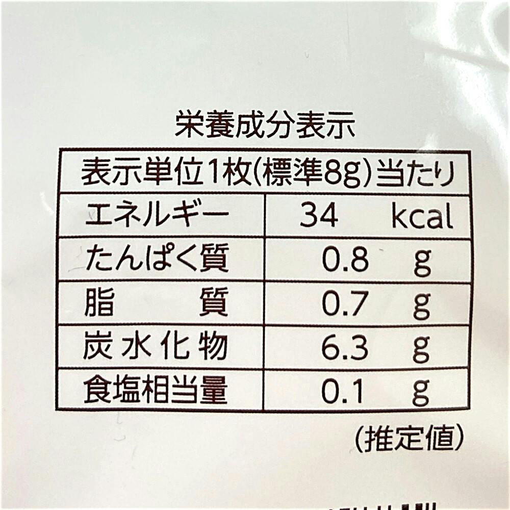 表示単位1枚(標準8g)当り/エネルギー:34kcal、たんぱく質:0.8g、脂質:0.7g、炭水化物:6.3g、食塩相当量:0.1g、(推定値)