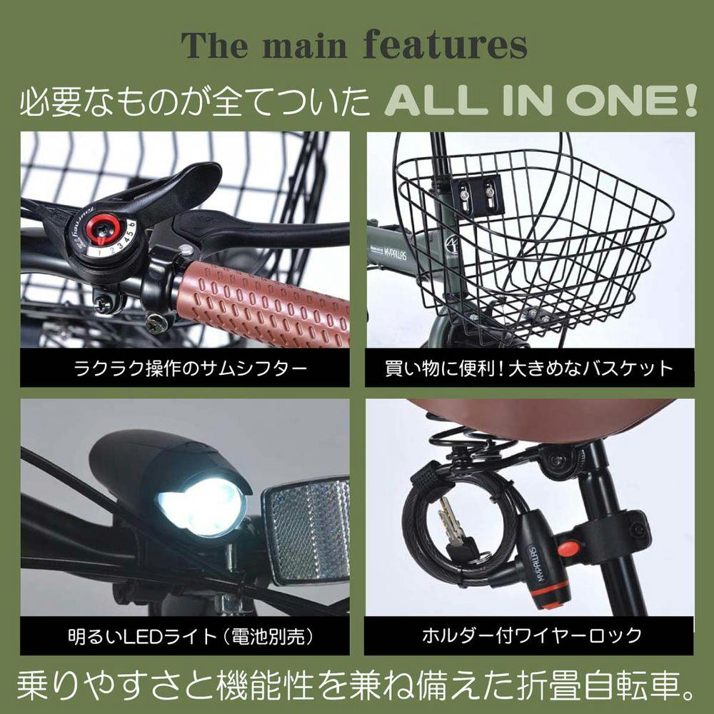 ●これからの毎日が快適!お洒落なスタイルに装備が充実!●マット調フレームのお洒落なデザイン!●バスケット・ライト・カギ付のオールインワン!●シマノ製6段ギア他、基本性能もしっかり!●コンパクトに折り畳めてクルマにも積める!