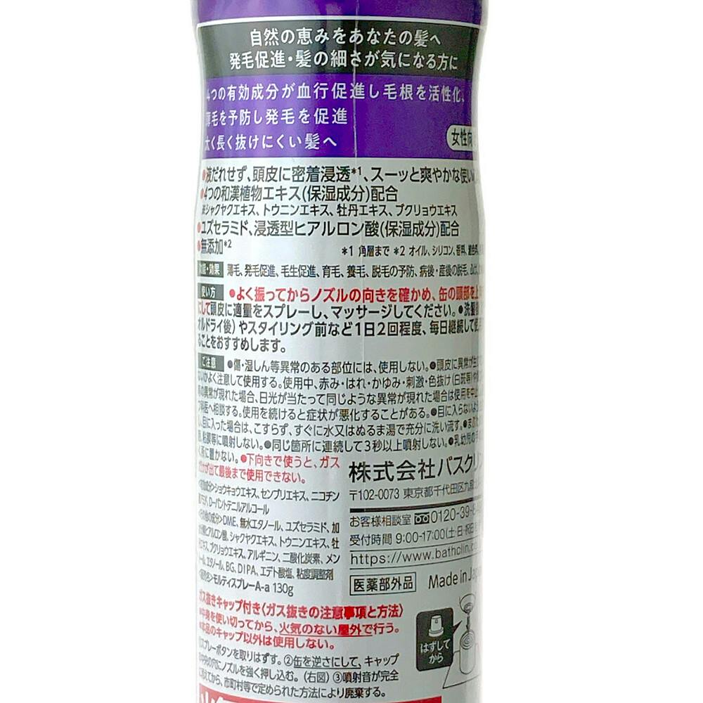 ●よく振ってからノズルの向きを確かめ、缶の頭部を上向きにして頭皮に適量をスプレーし、マッサージしてください。●洗髪後(タオルドライ後)やスタイリング前など1日2回程度、毎日継続して使用することをおすすめします。