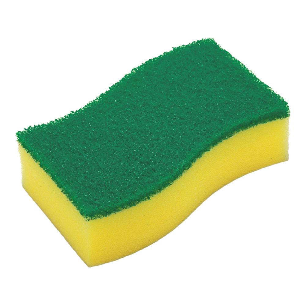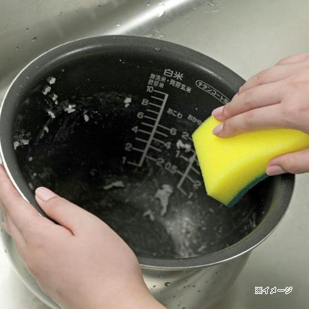 ウレタンスポンジとナイロン不織布(ハイブリッド研磨粒子つき)の貼合せスポンジ。手に無理なくしっくりなじむウェーブカット。フッ素加工品、ガラス製品などもキズつけにくく、こびりつきや、コゲ、茶しぶまでしっかり落とす。