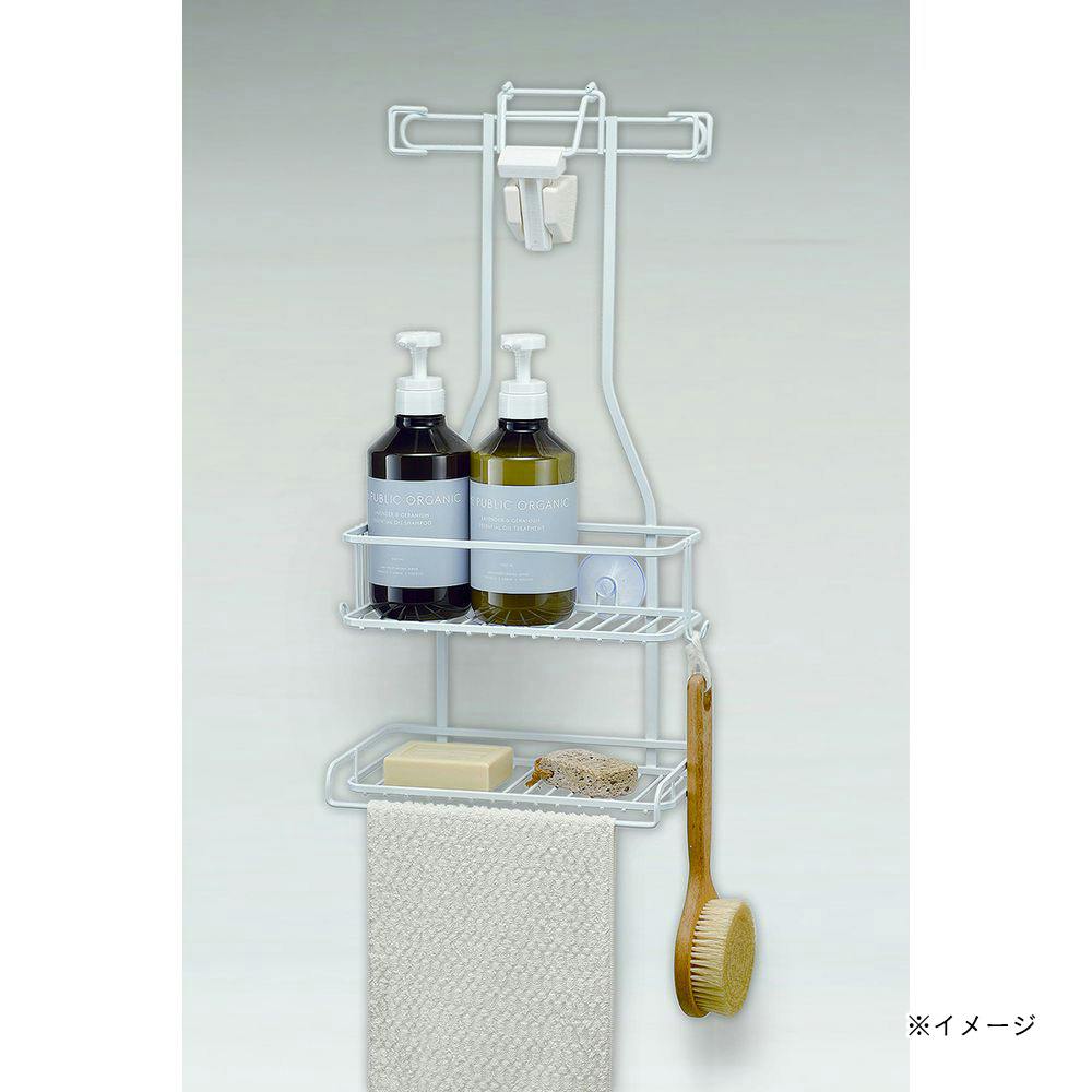 ●シャワーフックを使ってボトルや小物をすっきり収納 ●上段にボトル3本収納、下段に小物