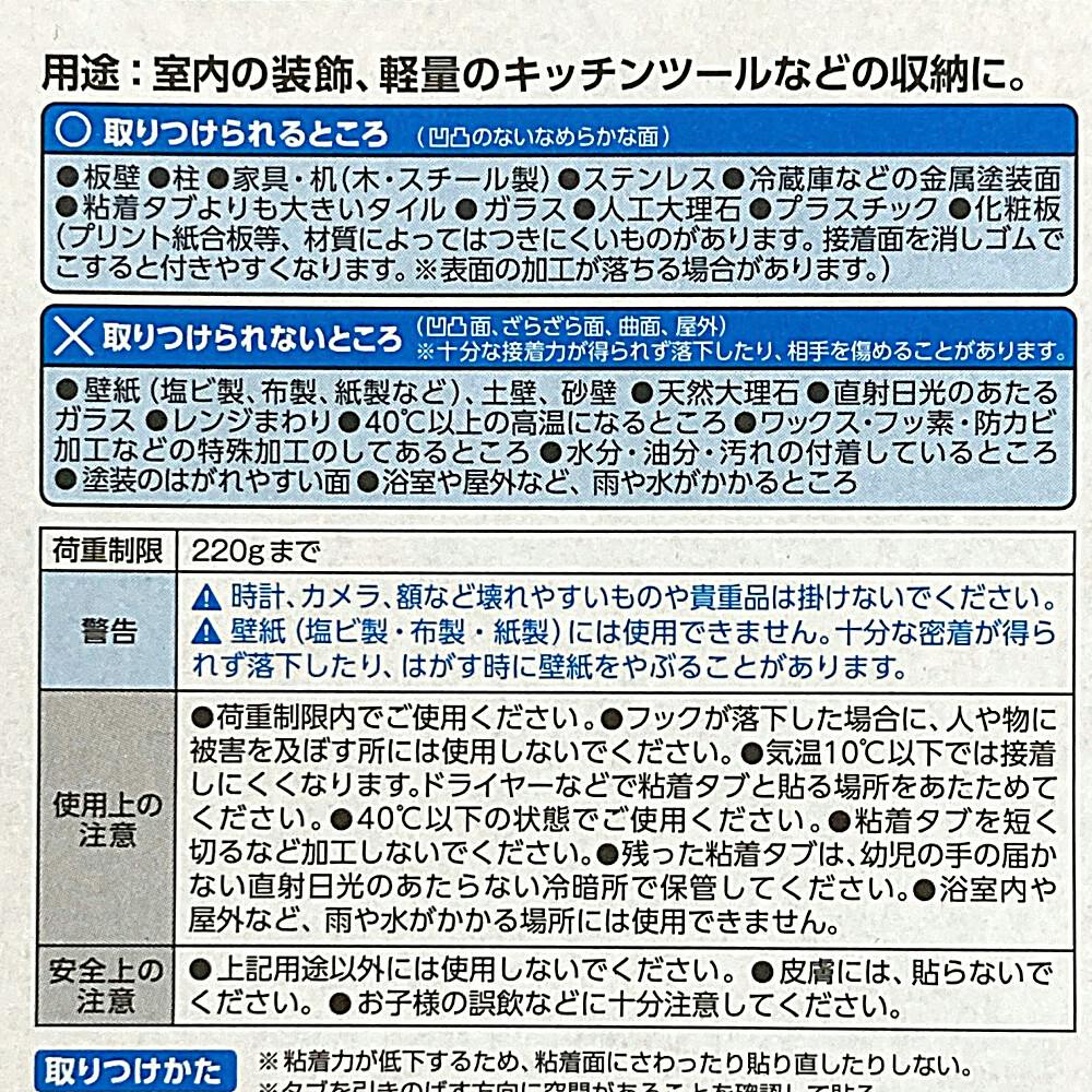 ●荷重制限内でご使用ください。●フックが落下した場合に、人や物に被害を及ぼす所には使用しないでください。●気温10℃以下では接着しにくくなります。ドライヤーなどで粘着タブと貼る場所をあたためてください。●粘着タブを短く切るなど加工しないでください。 など