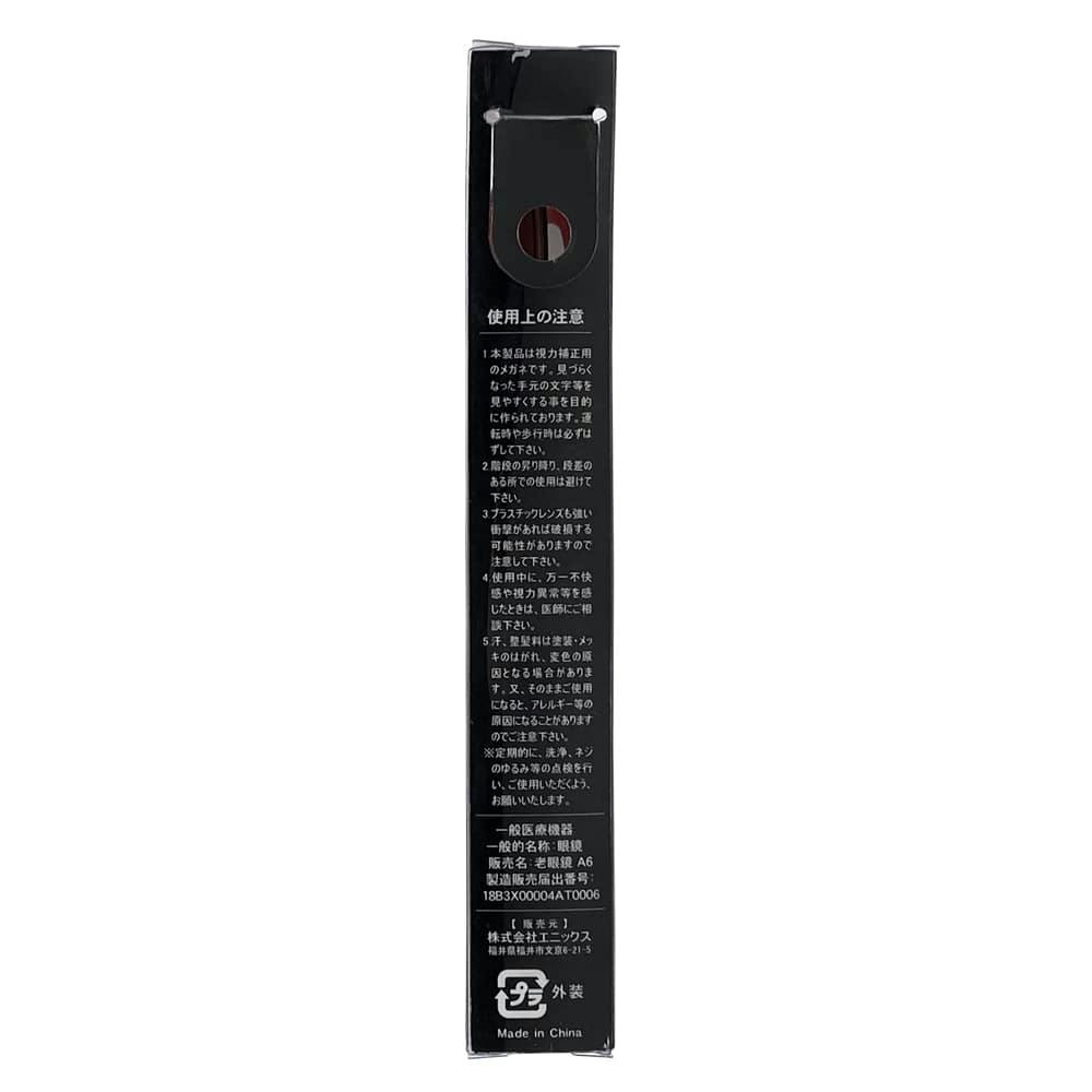 本製品は視力補正用のメガネです。見づらくなた手元の文字等を見やすくする事目的に作られております。運転時や歩行時は必ず外して下さい。●階段の昇り降り、段差のある所での使用は避けて下さい。●プラスチックも強い衝撃で破損する可能性がありますので注意して下さい。