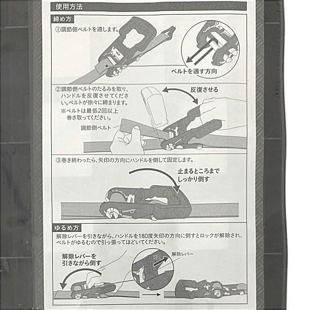 ●本製品は荷物の結束固定専用です。けん引、吊り下げ等、本来の用途以外には使用しないでください。●火のそばに置かないでください。●使用荷重以上のご使用はおやめください。●ベルトをねじったり結んだりしないで下さい。