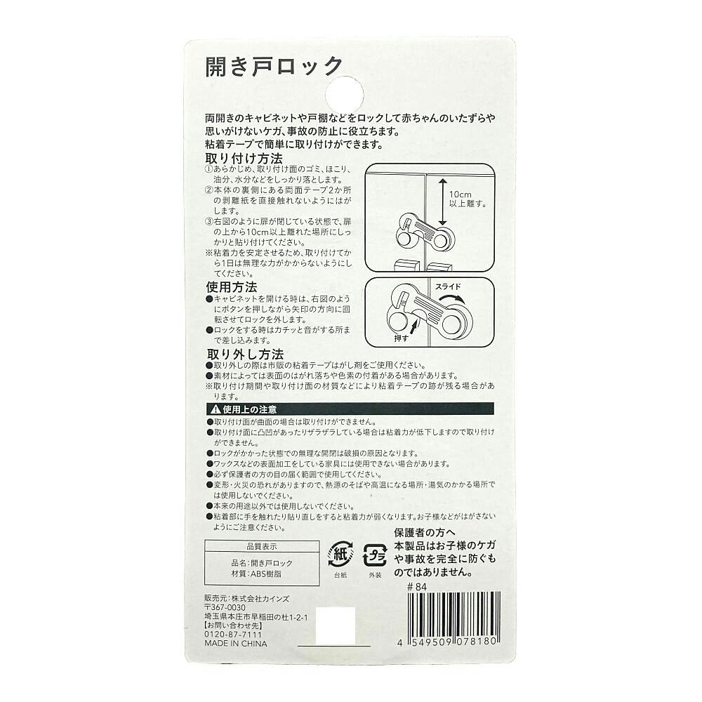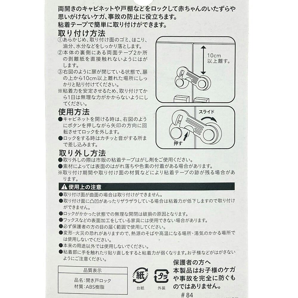●両開きのキャビネットや戸棚などをロックして赤ちゃんのいたずらや思いがけないケガ、事故の防止に役立ちます。●粘着テープで簡単に取り付けができます。