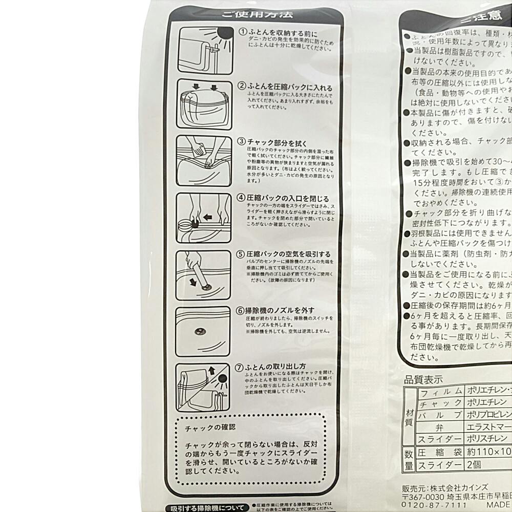 ●ノズルをバルブに当てるだけでラクラク吸引。●空気が逆流しないオートロックバルブ。●チャック部の色で密閉確認。便利なスライダー付き。●かさばるふとんを約1/3に圧縮。●圧縮作業が苦手でも大丈夫。●空気が逆流しない。●サイクロンクリーナーにも対応