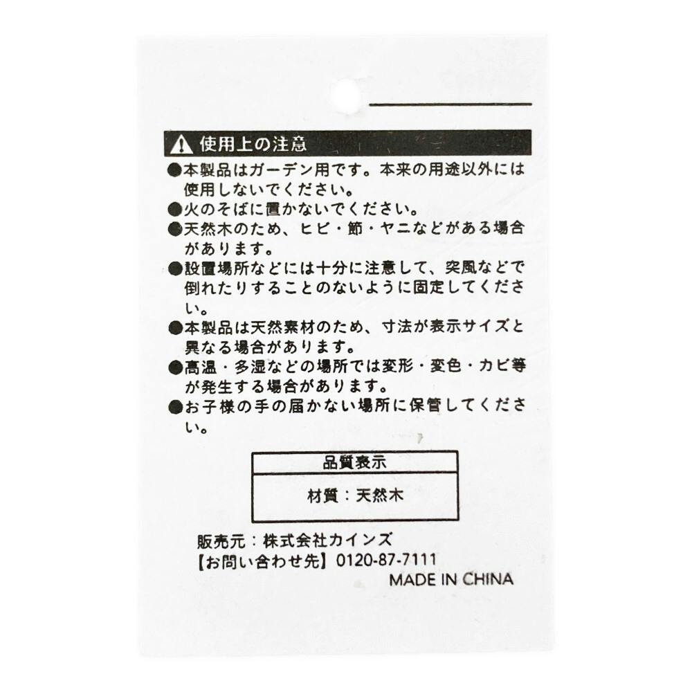 ●本製品はガーデン用です。本来の用途以外には使用しないでください。●火のそばに置かないでください。●天然木のため、ヒビ・節・ヤニなどがある場合があります。●設置場所などには十分に注意して、突風などで倒れたりすることのないように固定してください。