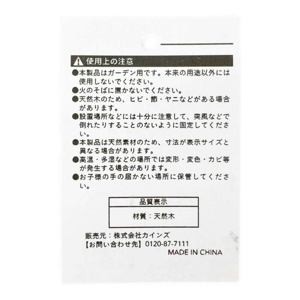 ●本製品はガーデン用です。本来の用途以外には使用しないでください。●火のそばに置かないでください。●天然木のため、ヒビ・節・ヤニなどがある場合があります。●設置場所などには十分に注意して、突風などで倒れたりすることのないように固定してください。