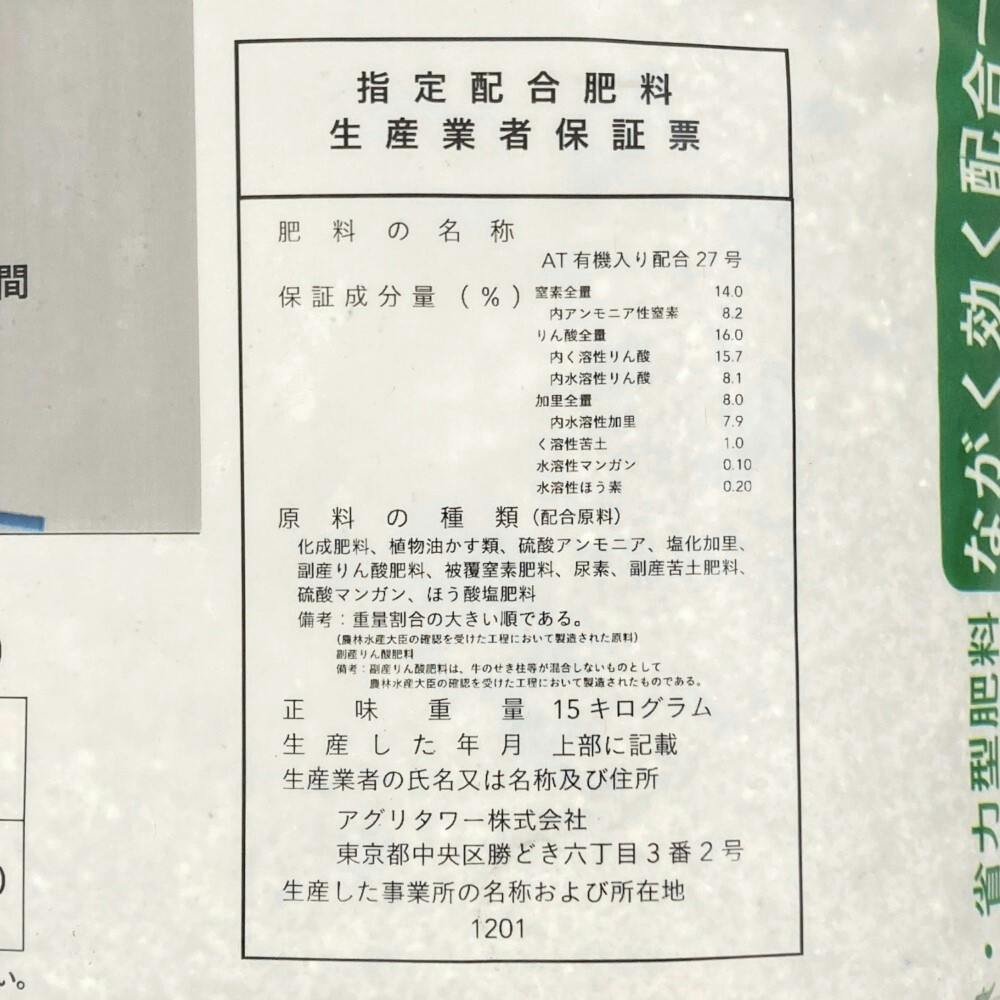 保証成分量/窒素全量:14.0%、内アンモニア性窒素:8.2%、りん酸全量:16.0%、内溶性りん酸:15.7%、内水溶性りん酸:8.1%、加里全量:8.0%、内水溶性加里:7.9%、溶性苦土:1.0 %、水溶性マンガン:0.10%、水溶性ほう素:0.20%、
