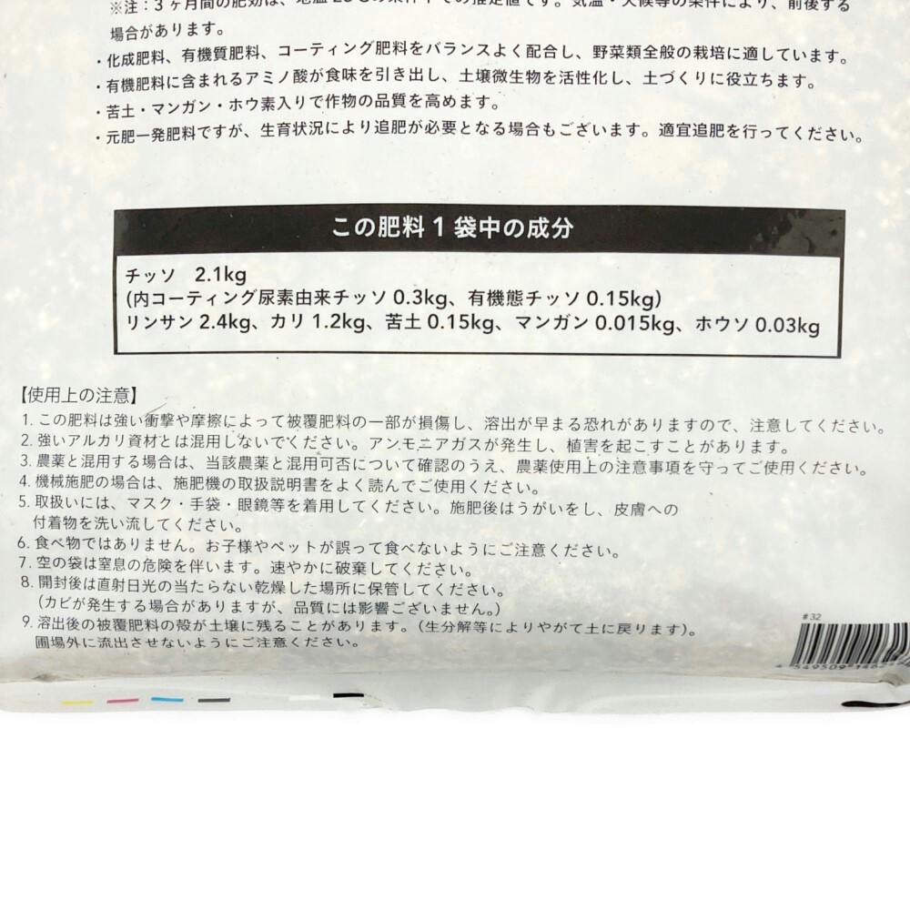 ●この肥料は強い衝撃や摩擦によって被覆肥料の一部が損傷し、溶出が早まる恐れがありますので、注意してください。●強いアルカリ資材とは混用しないでください。アンモニアガスが発生し、植害を起こすことがあります。