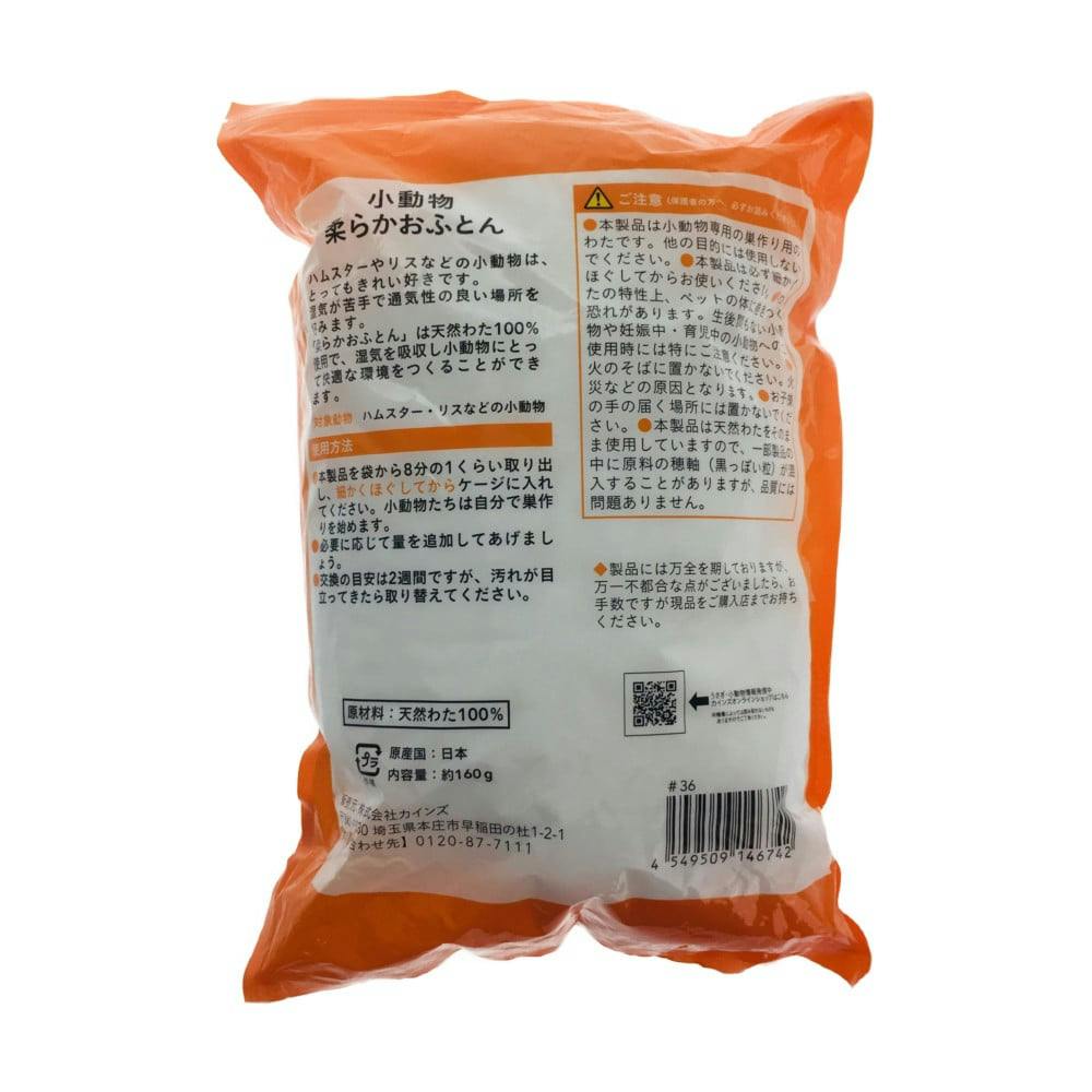 ●本製品は小動物専用の巣作り用のわたです。他の目的には使用しないでください。●本製品は必ず細かくほぐしてからお使いください。●わたの特性上、ペットの体に巻きつく恐れがあります。生後間もない小動物や妊娠中・育児中の小動物へのご使用時には特にご注意ください。