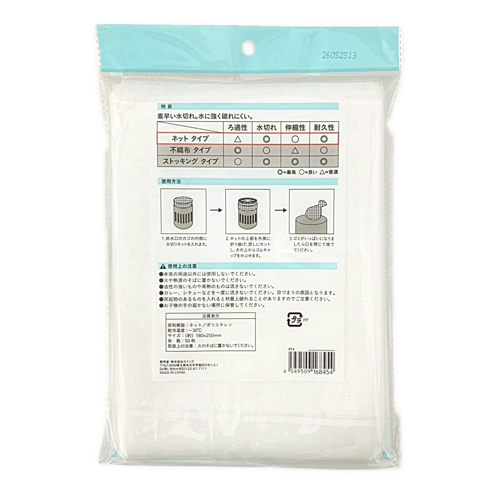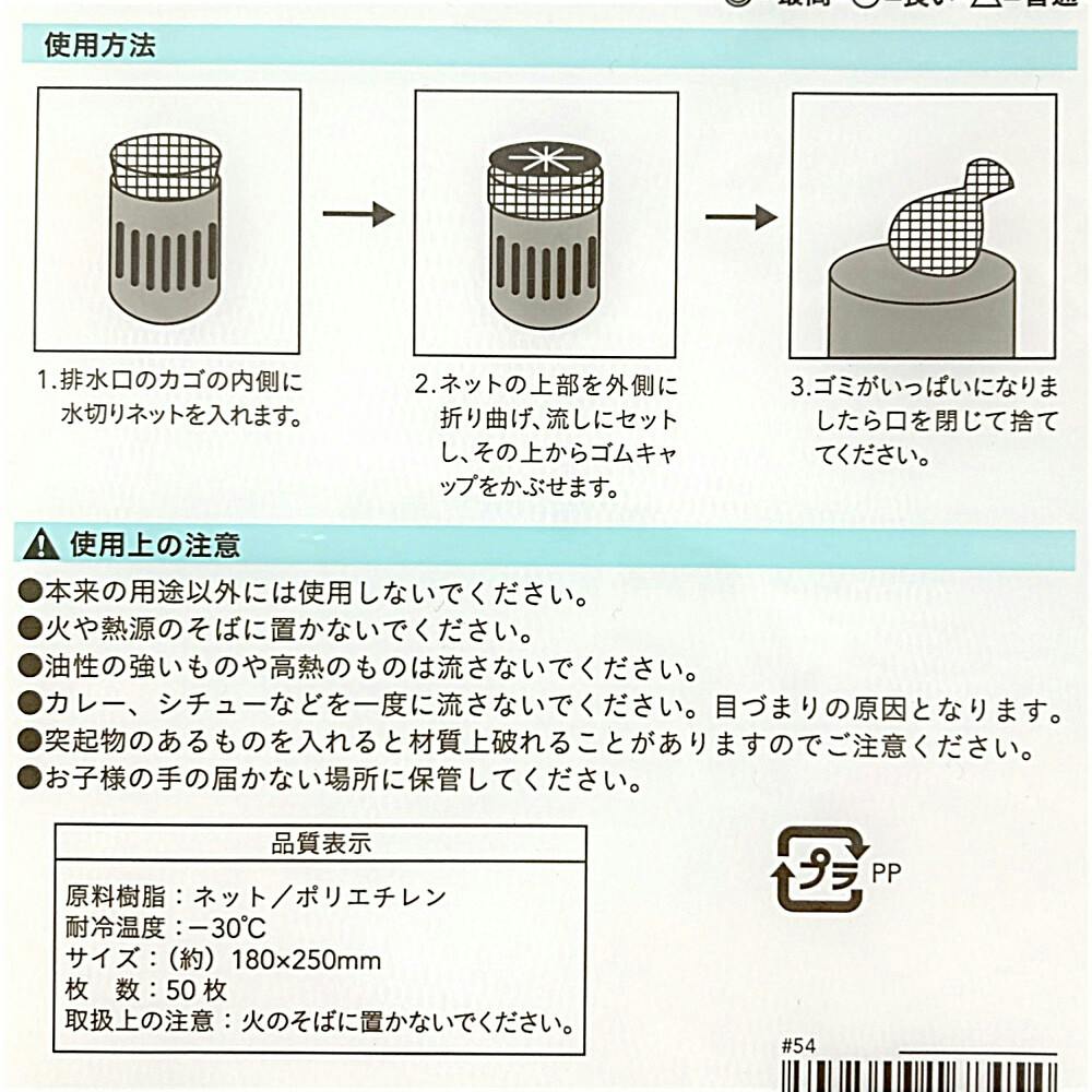 1.排水口のカゴの内側に水切りネットを入れます。2.ネット上部を外側に折り曲げ、流しにセットし、その上からゴムキャップをかぶせます。3.ゴミがいっぱいになりましたら口を閉じて捨ててください。