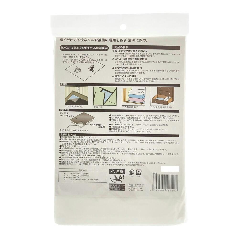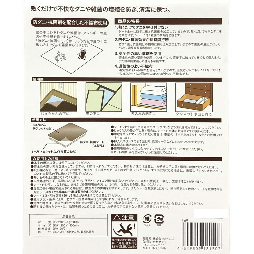 ●敷くだけでダニを寄せ付けない●防ダニ・抗菌効果が長時間持続●安全性の高い薬剤を使用●通気性のよい不織布●じゅうたん、ラグの下に●畳みの下に●防ダニ●抗菌●カットOK