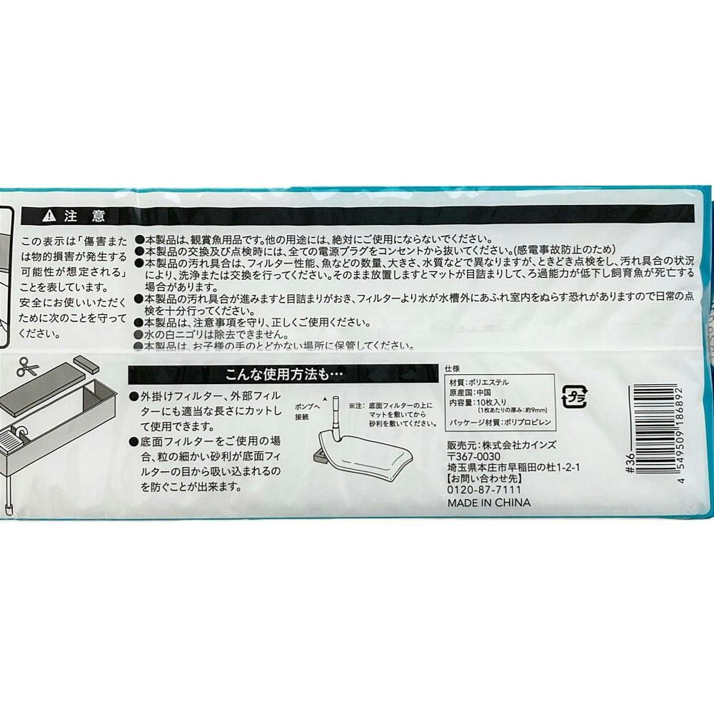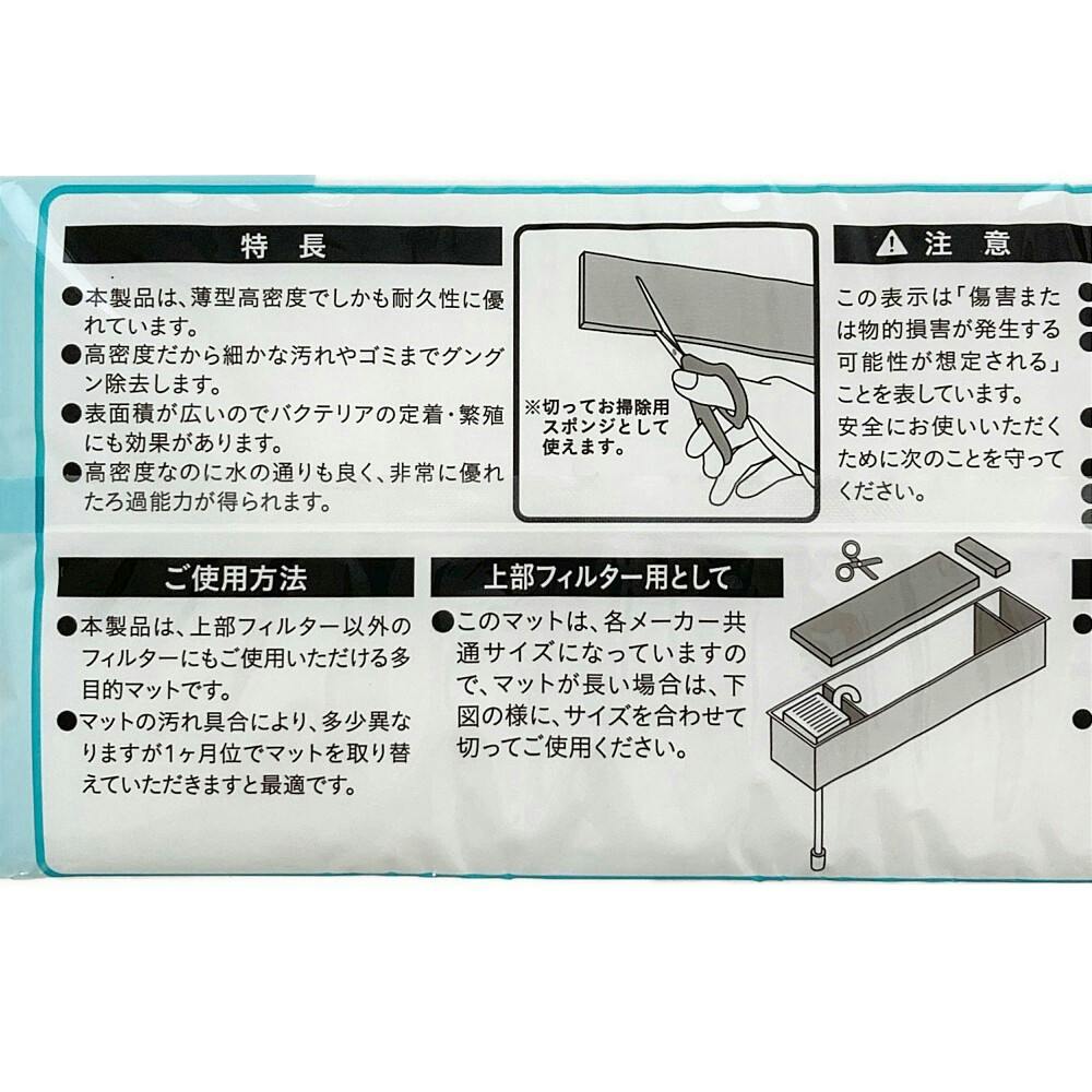 ●本製品は、上部フィルター以外のフィルターにもご使用いただける多目的マットです。●マットの汚れ具合により、多少異なりますが1ヶ月位でマットを取り替えていただきますと最適です。