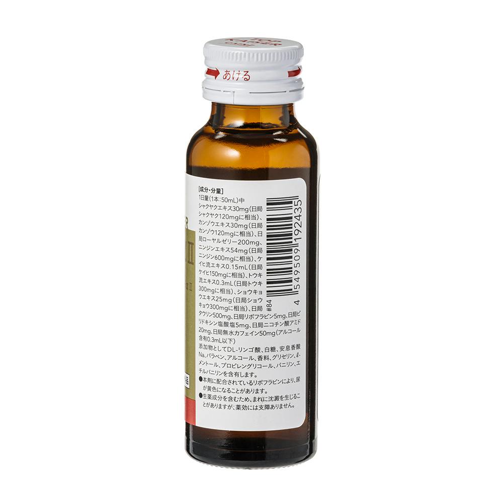 1本(50mL)中/シャクヤクエキス:30mg(日局シャクヤク120mgに相当)、カンゾウエキス:30mg(日局カンゾウ120mgに相当)、日局ローヤルゼリー:200mg、ニンジンエキス:54mg(日局ニンジン600mgに相当)、ケイヒ流エキス:0.15ml(日局ケイヒ150mgに相当)、他