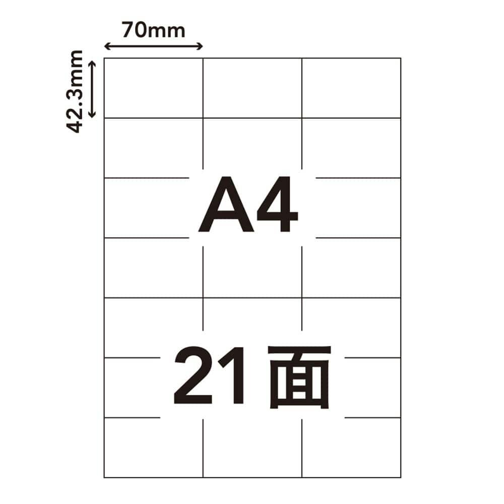 ●商品サイズ:A4(タテ29.7×ヨコ21.0cm) 総厚0.147mm ラベル厚0.093mm ●面付:21面 ●1片サイズ:42.3×70mm ●白色度:85% ●ラベル坪量:96g/平方メートル