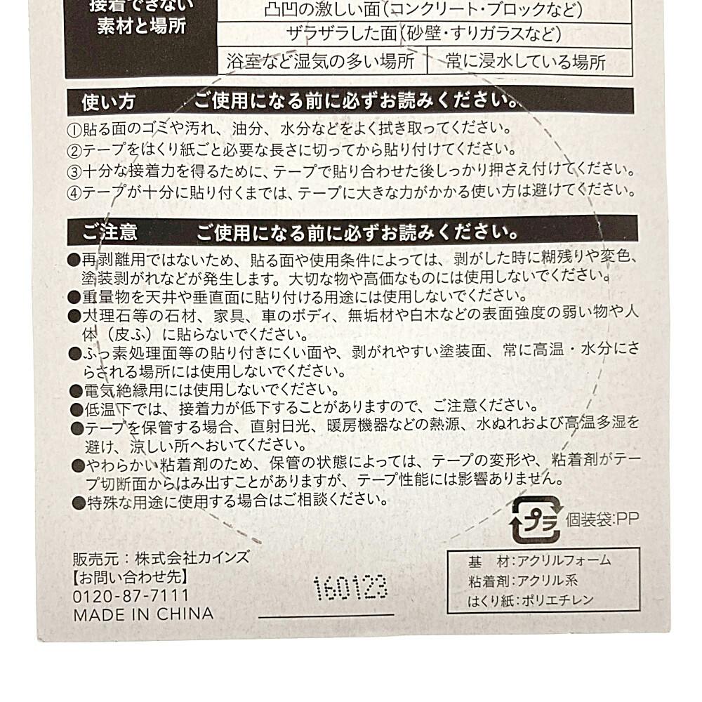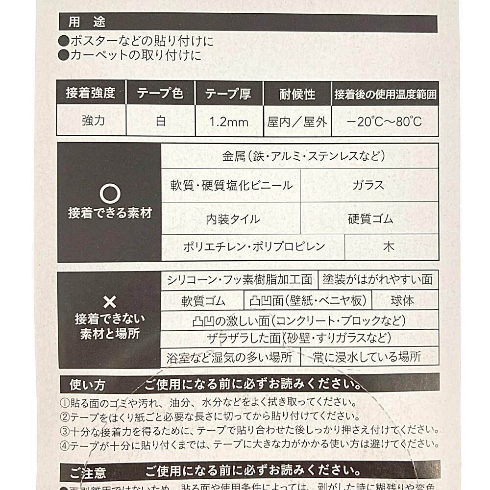 ●再剥離用ではないため、貼る面や使用条件によっては、剥がした時に糊残りや変色、塗装剥がれなどが発生します。大切な物や高価なものには使用しないでください。●重量物を天井や垂直面に貼り付ける用途には使用しないでください。
