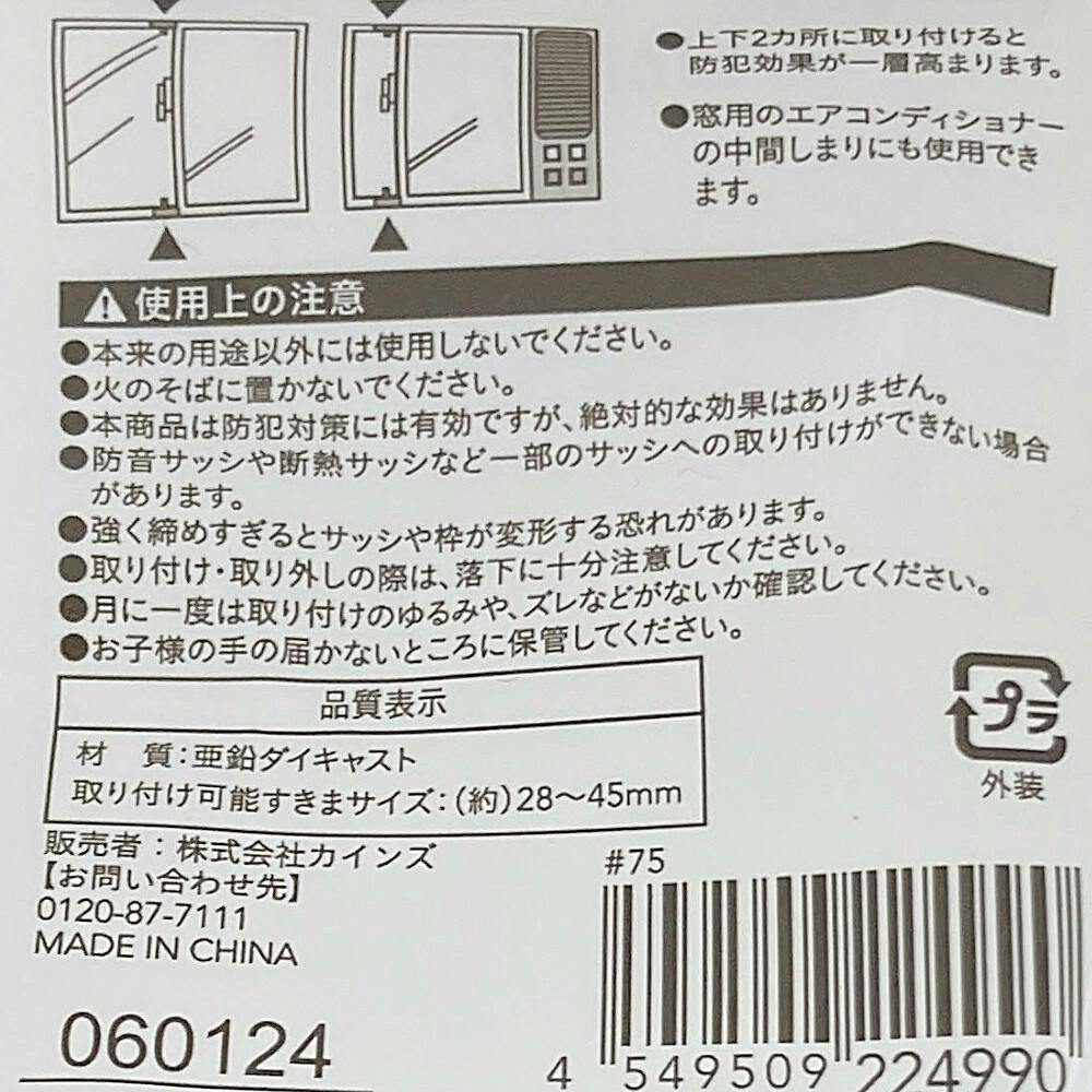 ●本来の用途以外には使用しないでください。●火のそばに置かないでください。●本商品は防犯対策には有効ですが、絶対的な効果はありません。●防音サッシや断熱サッシなど一部のサッシへ取り付けができない場合があります。