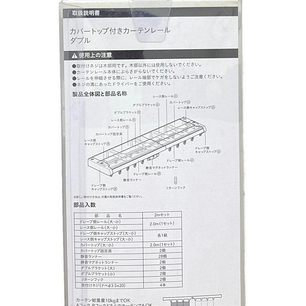 ●ドレープ側レール(大・小)、レース側レール(大・小):2.0m(1セット) ●ドレープ側キャップストップ(大・小)、レース側キャップストップ(大・小):各1組 ●カバートップ(大・小):2.0m(1セット) ●カバートップ固定具:2個