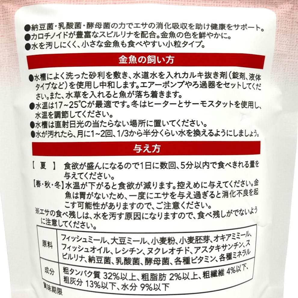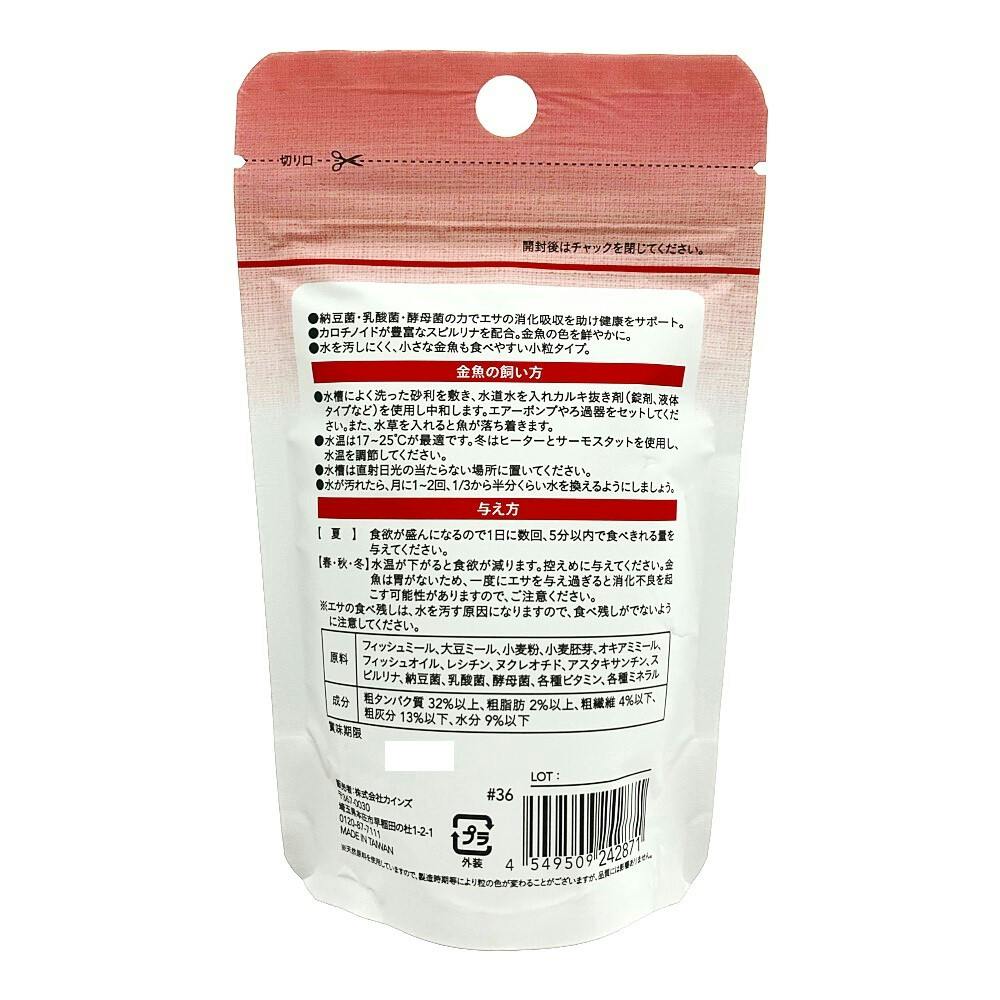 ●納豆菌、乳酸菌、酵母菌の力でエサの消化吸収を助け健康をサポート。●カロチノイドが豊富なスピルリナを配合。金魚の色を鮮やかに。●水を汚しにくく、小さな金魚も食べやすい小粒タイプ。