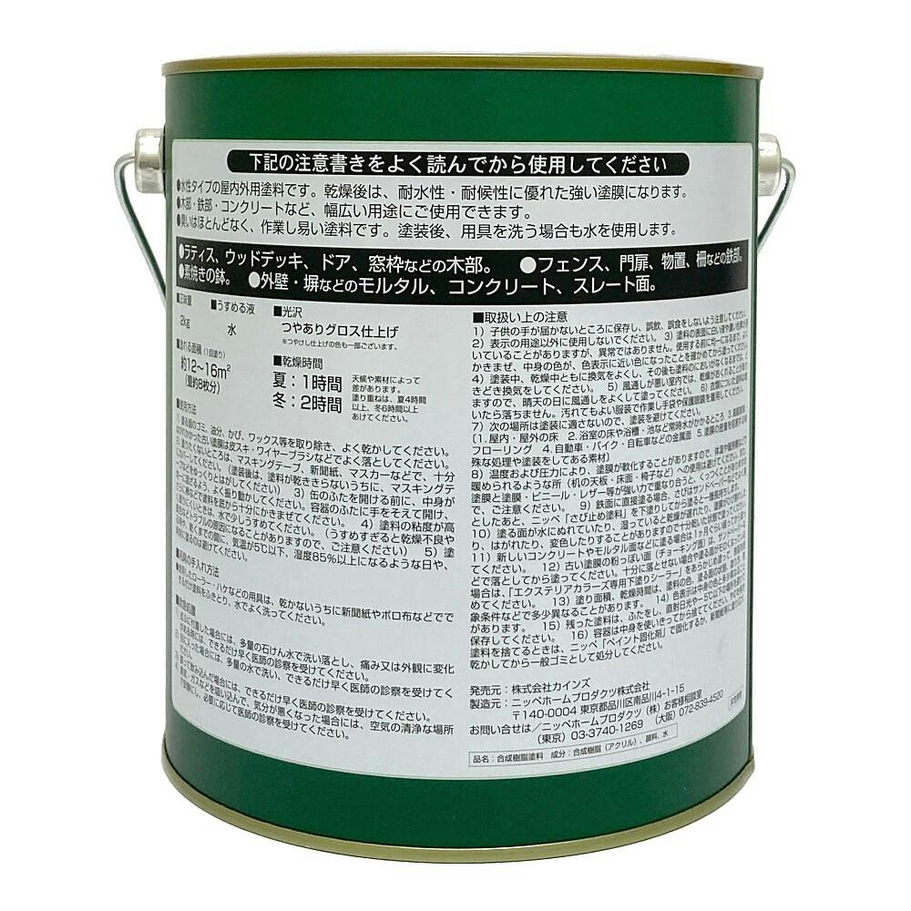 ●水性タイプの屋内外用塗料です。乾燥後は、耐水性・耐候性に優れた強い塗膜になります。●木部・鉄部・コンクリートなど、幅広い用途にご使用できます。●臭いはほとんどなく、作業し易い塗料です。塗装後、用具を洗う場合も水を使用します。