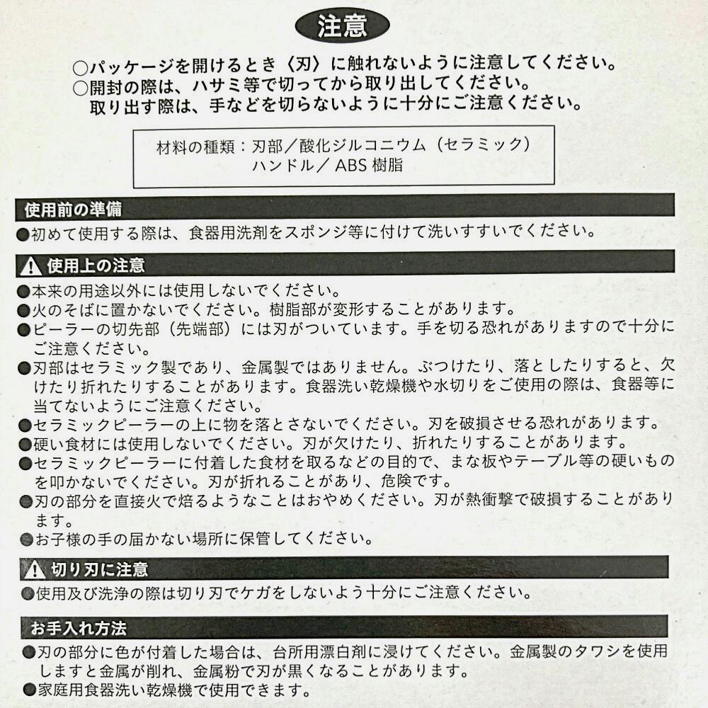 ●本来の用途以外には使用しないでください。●火のそばに置かないでください。樹脂部が変形することがあります。●ピーラーの切先部(先端部)には刃がついています。手を切る恐れがありますので十分にご注意ください。